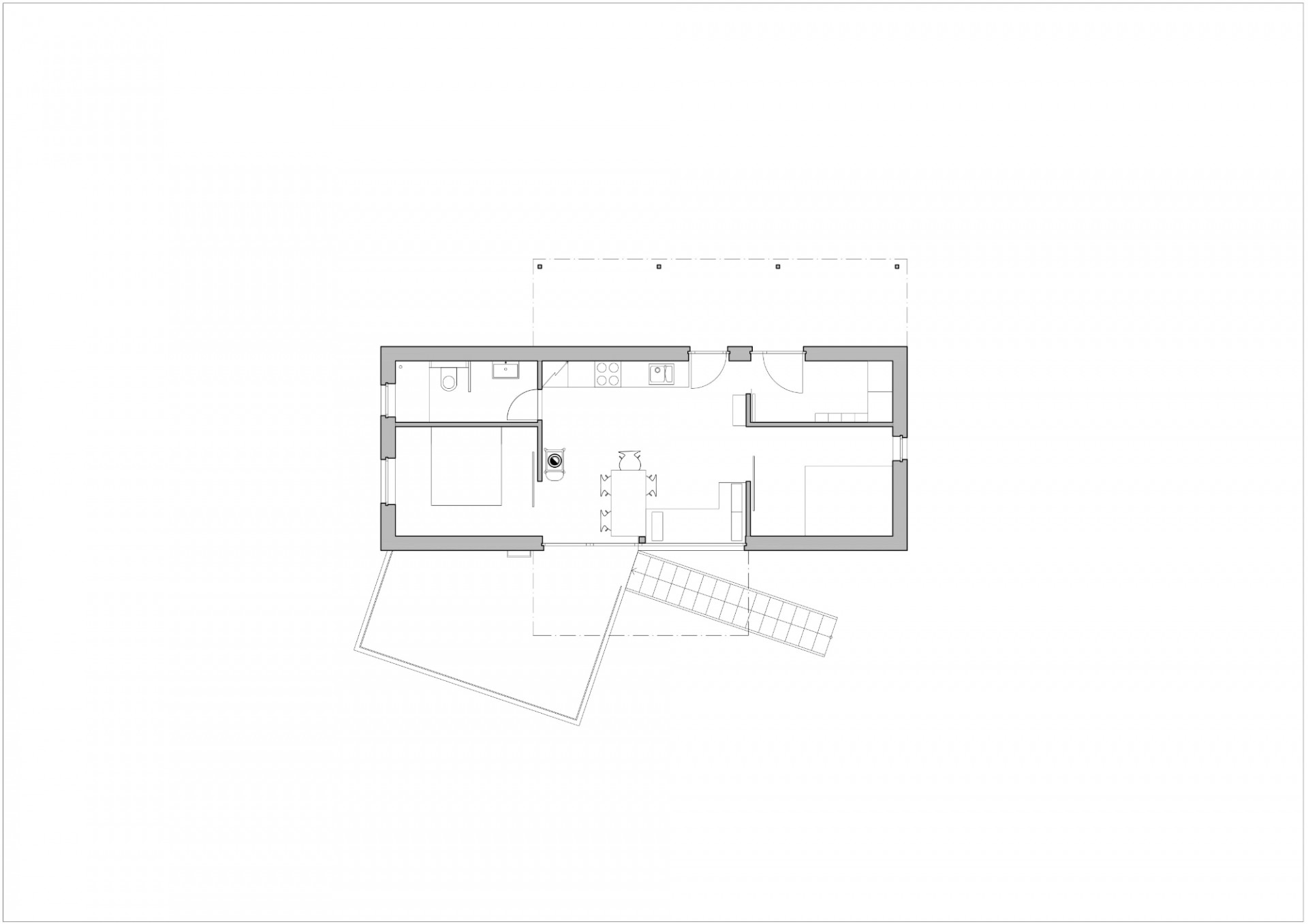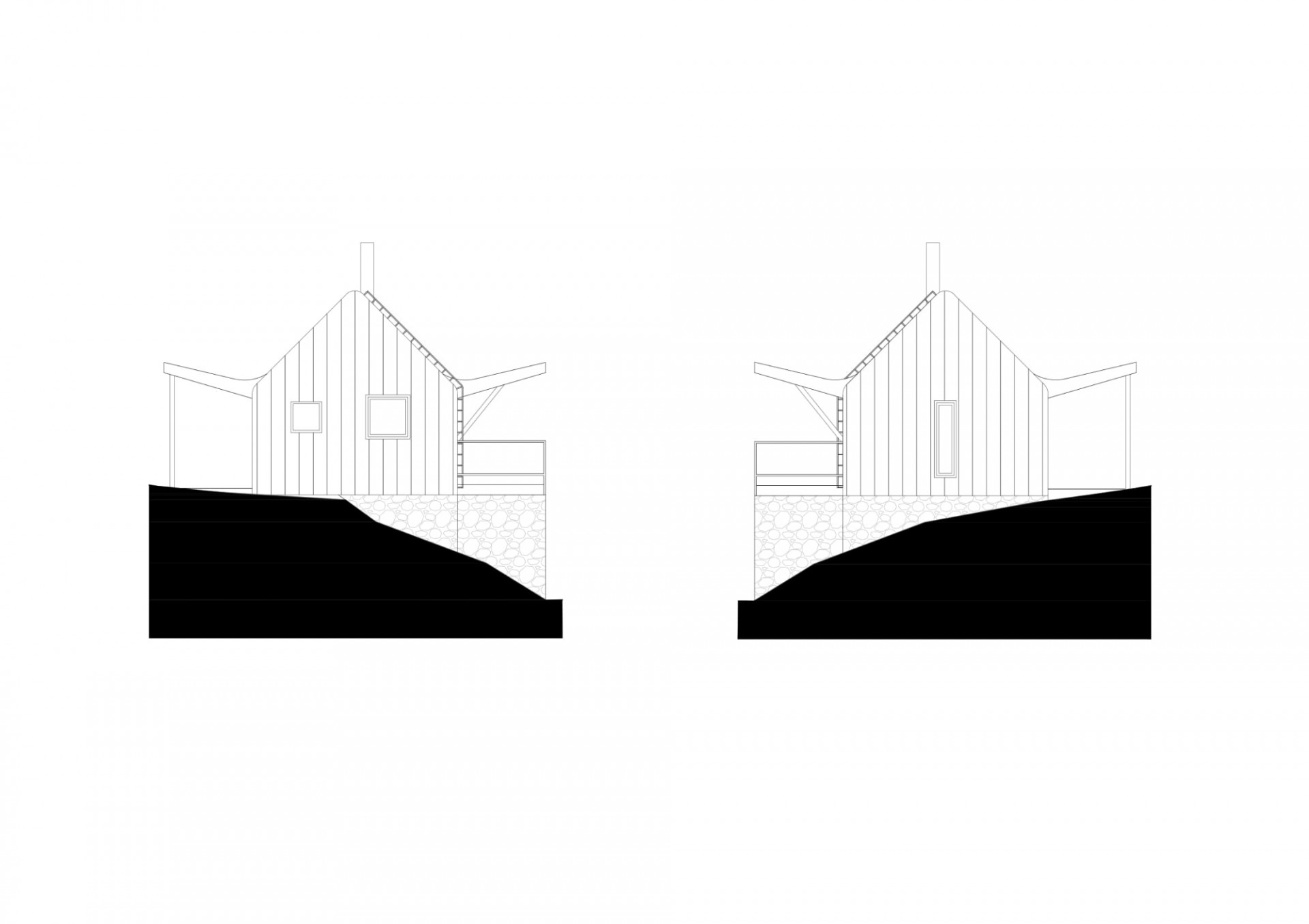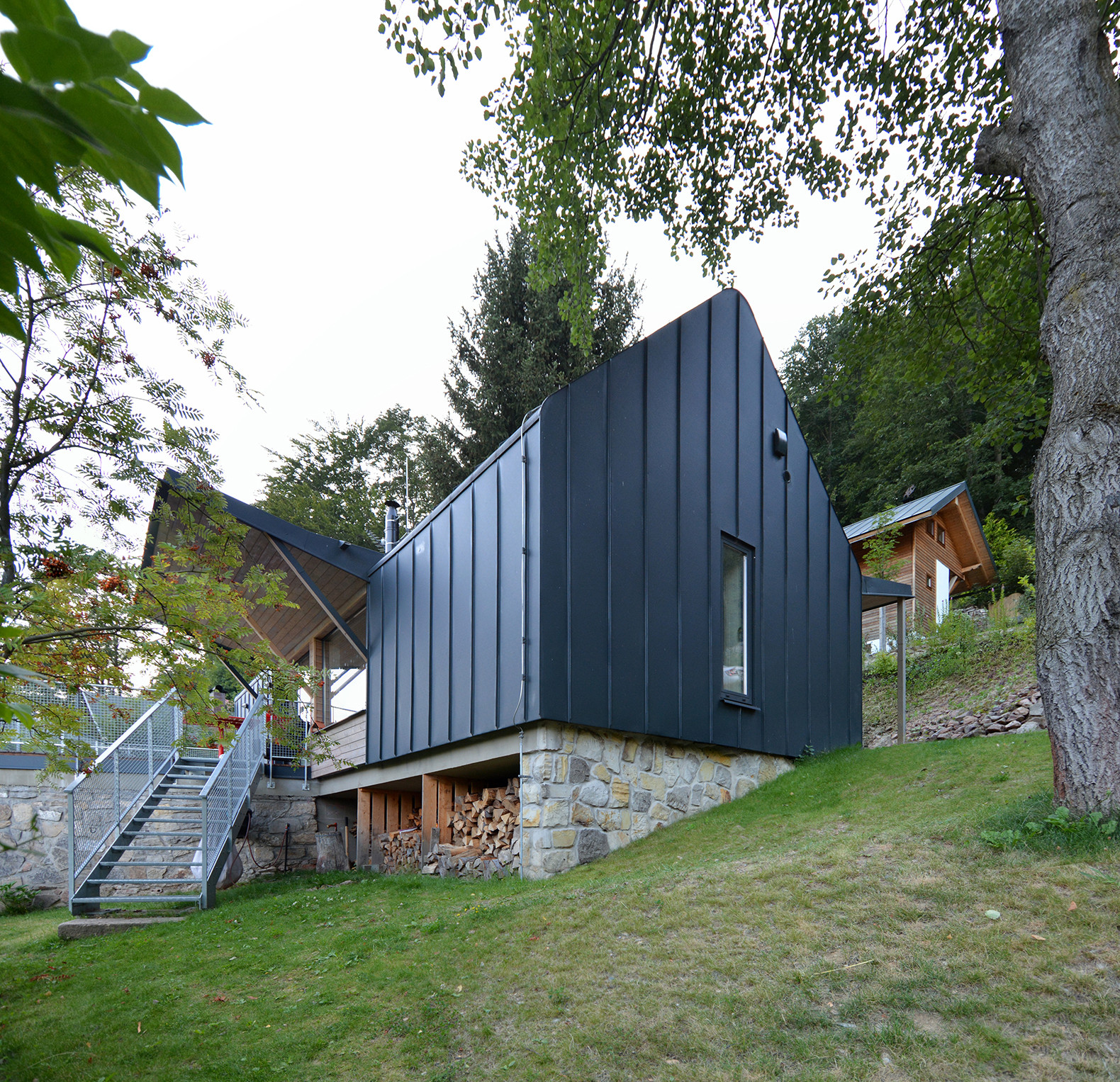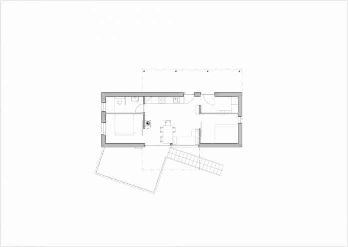 Na podélném objektu se sedlovou střechou, se štíty na východě a západě, jsou dvě stříšky. Jižní střecha stíní terasu s velkým oknem vyhlížejícím do údolí a severní střecha chrání příchozí před nepříznivými povětrnostními vlivy. Vnitřní prostor chaty je otevřen až do krovu, centrem je obytný prostor s kamny navazující na terasu. Dvě ložnice jsou od obytného prostoru oddělitelné posuvnými dveřmi. Na jižní straně je k terase přistavěno venkovní schodiště navazující na sousední chatu příbuzných.