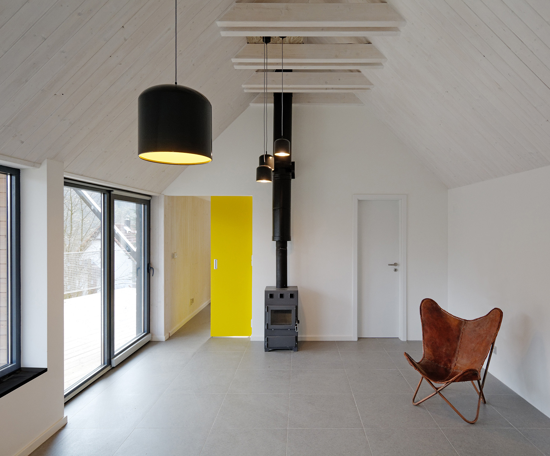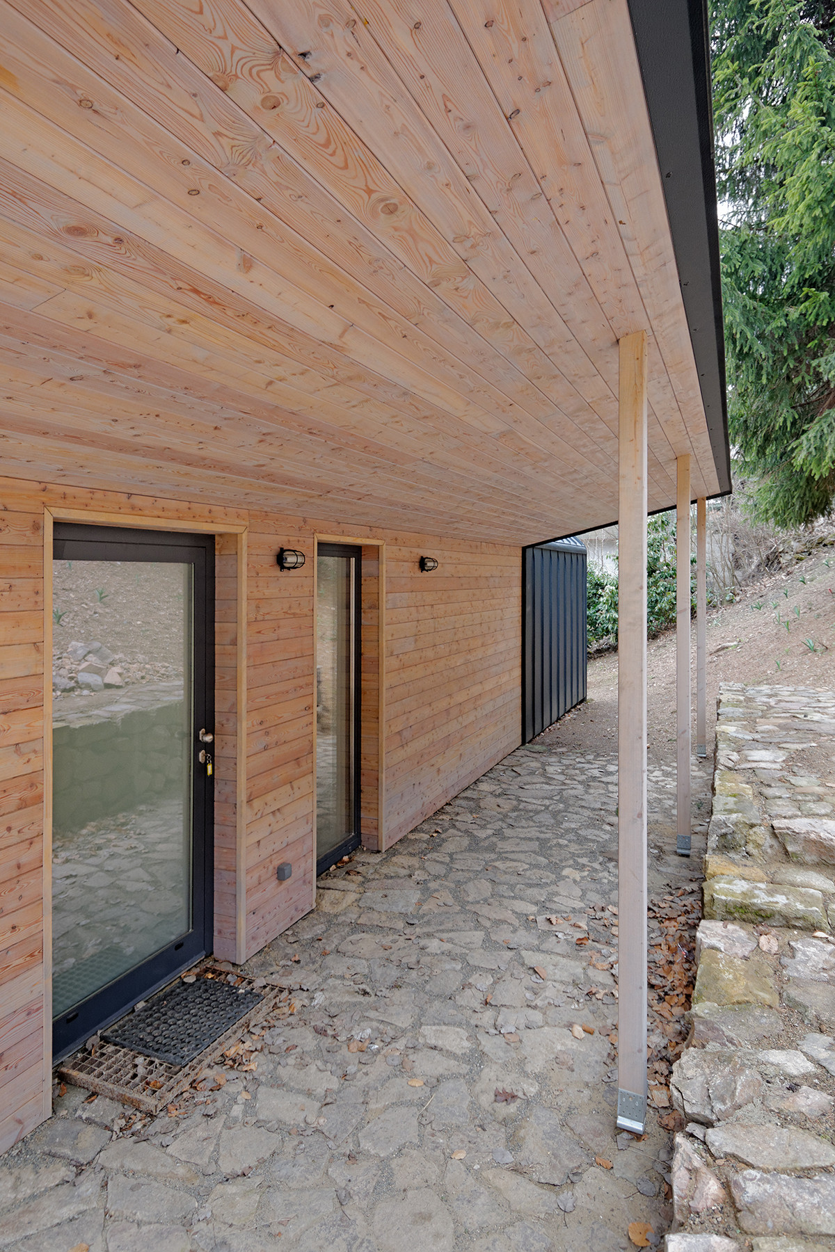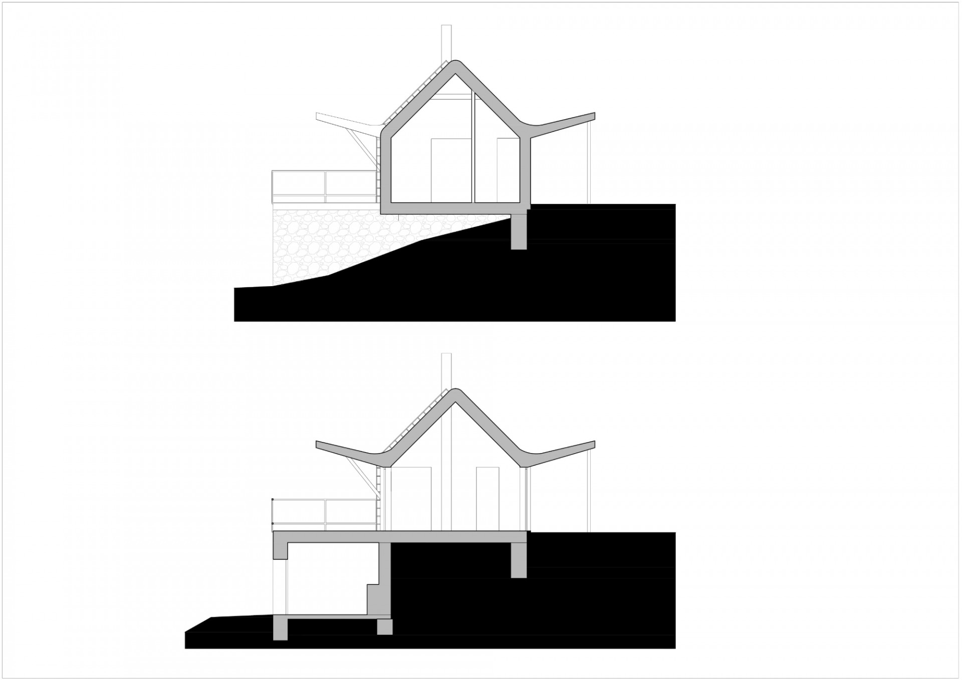 Na podélném objektu se sedlovou střechou, se štíty na východě a západě, jsou dvě stříšky. Jižní střecha stíní terasu s velkým oknem vyhlížejícím do údolí a severní střecha chrání příchozí před nepříznivými povětrnostními vlivy. Vnitřní prostor chaty je otevřen až do krovu, centrem je obytný prostor s kamny navazující na terasu. Dvě ložnice jsou od obytného prostoru oddělitelné posuvnými dveřmi. Na jižní straně je k terase přistavěno venkovní schodiště navazující na sousední chatu příbuzných.