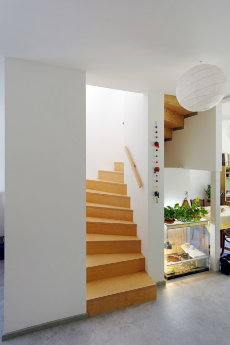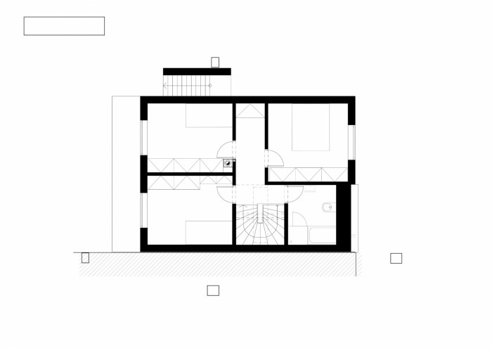 Vchod do domu je přes zádveří. Navazuje na vstupní chodbu, ze které se vchází do hlavního obytného prostoru, který je otevřený a propojuje kuchyni, jídelnu a obývací pokoj. Za zádveřím je technická místnost a wc. Z hlavního obytného prostoru v přízemí je přístup na zahradu. Do 2.NP se vystupuje po křivočarém schodišti, které je vloženo mezi kuchyňskou a pobytovou část přízemí. Z chodby se vstupuje do tří ložnic a koupelny.