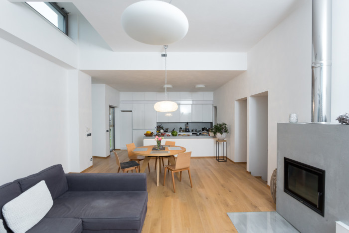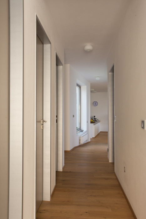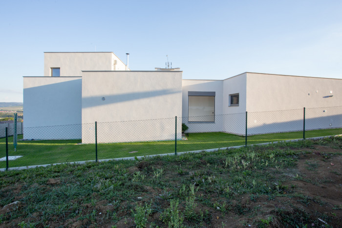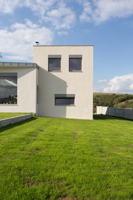 K veřejné komunikaci se přimyká západní fasáda se vstupem do domu a garáže, která zároveň tvoří první kvádr kompozice. Odtud se chodbou projde druhým objemem, který obsahuje servisní místnosti, sociální zařízení a dětské pokoje. Chodba eskaluje ve třetím kvádru, jenž je vyplněn obytným prostorem s jídelnou a kuchyní. Tento kvádr je prvním objemem, který také klesá oproti vstupu a kopíruje tak stávající terén. Z obytného prostoru se dá vstoupit jednak na jižní terasu, která je společná i pro dětské pokoje a také lze vstoupit do posledního objemu, který obsahuje v přízemí ložnici s koupelnou a v patře pracovnu, která se dá také využít jako pokoj pro hosty. Tato místnost má samostatné wc a také výstup na severní terasu. Tento objem je opět posunut dolů vůči vstupu i obytnému prostoru.