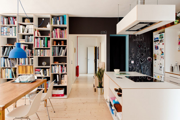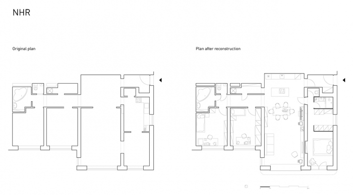 Pôvodná dispozícia bytu bola organizovaná cez centrálnu halu, ktorú majitelia vyžívali ako pracovňu. Po odstránení priečok táto miestnosť splynula s jestvujúcou obývacou izbou v jeden presvetlený priestor, v ktorom sa koncentrujú všetky spoločenské aktivity rodiny a častých návštev priateĺov. Tento lineárny priestor je ukončený veľkým oknom s hlbokým "pobytovým" parapetom s výhľadom do predzáhradky.
