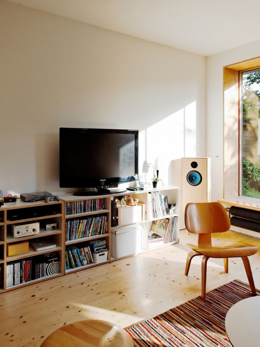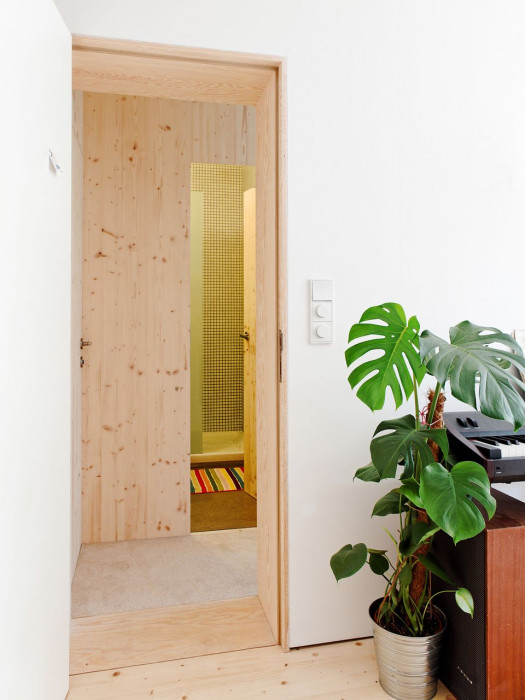 V byte sú použité prírodné materiály. Plochy sú upravené prevažne bielou farbou, svetlým drevom ihličnatých stromov prípadne liatou cementovou stierkou na podlahách. Nábytok je realizovaný z neupravených preglejkových častí stavebnicovým systémom.