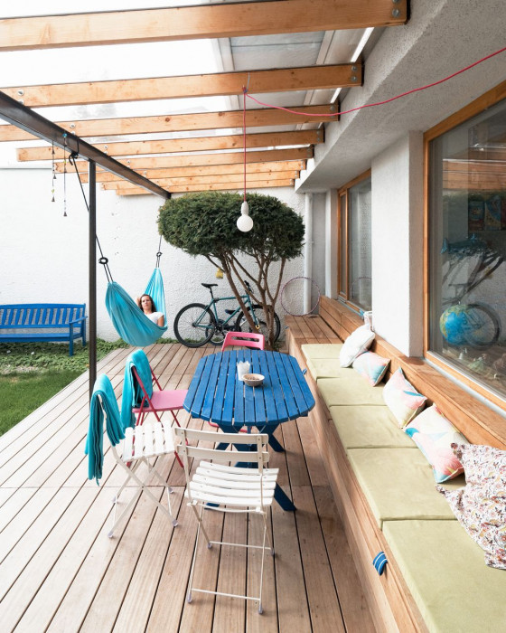 Okno sa stalo magnetom pre detské hry či relaxáciu rodičov. Roleta nainštalovaná nad otvorom plní funkciu projekčnej plochy počas filmových večerov.