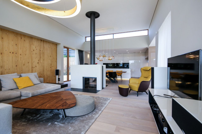 Nenápadná hra s osvětlením, působivě se „vznášející“ podsvětlený kuchyňský ostrůvek spolu s odlesky skříněk s povrchem provedeným ve vysokém lesku, osvětlení schodiště do dětského pokoje či krb uprostřed obývacího pokoje s výrazným komínovým tělesem, to vše jsou detaily, které dodávají domu osobitost a jedinečný styl.