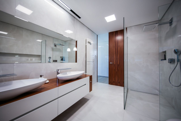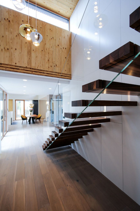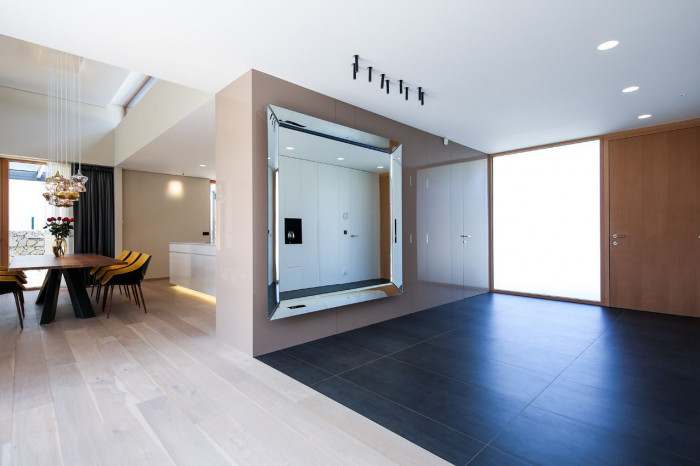 Otevřený prostor obývacího pokoje je opticky rozdělený pouze stěnou krbu, který je netypicky umístěný uprostřed místnosti. Ložnice rodičů a dětský pokoj disponují vlastními koupelnami a šatnami. Celou dispozici doplňuje pracovna v přízemí, přístupná ze vstupní haly.