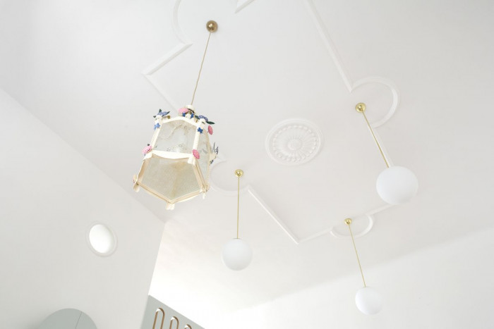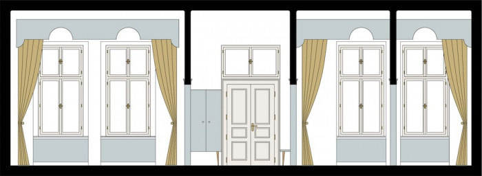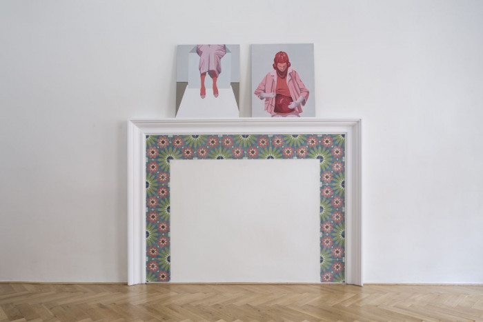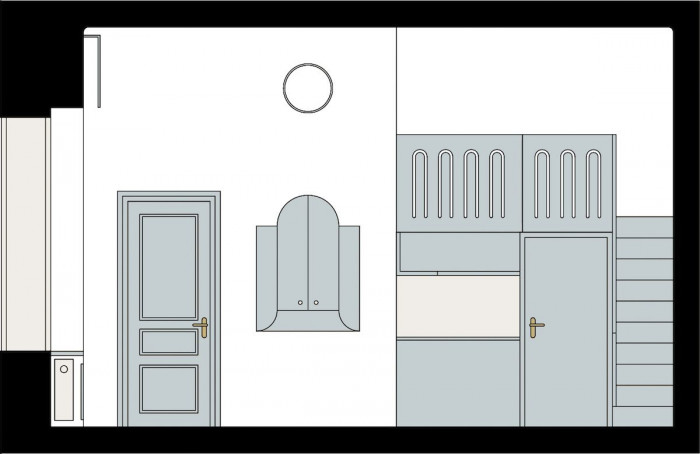 Současně jsme se volně inspirovali dobovým architektonickým diskursem, který se odehrával evidentně stranou pragmatických problémů architekta a stavitele domu Václava Žaloudka. Zatímco jeho dům kopíroval osvědčenou rakouskouherskou klasiku, tedy co nejlevnější bydlení pro dělnické rodiny se společným hygienickým zázemím, české architektonické špičky se paralelně trápily hledáním národního slohu a rodícími se kritickými reakcemi na roli dekorativních prvků v architektuře. Dobovými architektonickými experimenty s oblouky a zjednodušenými formami dekorací jsme se volně inspirovali pro pojetí současného interiéru. Pokrok z roku 1927 přeložený do roku 2017 s mírnou nadsázkou nezbytnou pro absorpci soudobých technologií od plynového kotle, přes oltář pro televizi, po skryté prvky online kontrolovaného vnitřního prostředí bytu. Obrazy a reprodukce dotvářejí most mezi historií bytu a současným světem.