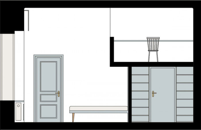 Z původního dvoupokojového bytu bez koupelny a záchodu jsme sofistikovaným prostorovým uspořádáním vytvořili plnohodnotné bydlení se dvěma ložnicemi, koupelnou a přesto stále větším obytným prostorem, než byl ten původní. Využili jsme vyšší strop pro rozšíření konstrukčního principu pavlače až do bytu na samostatnou pracovnu na galerii. Fakticky jsme stavebními úpravami rozšířili využitelnou podlahovou plochu bytu téměř o čtvrtinu.