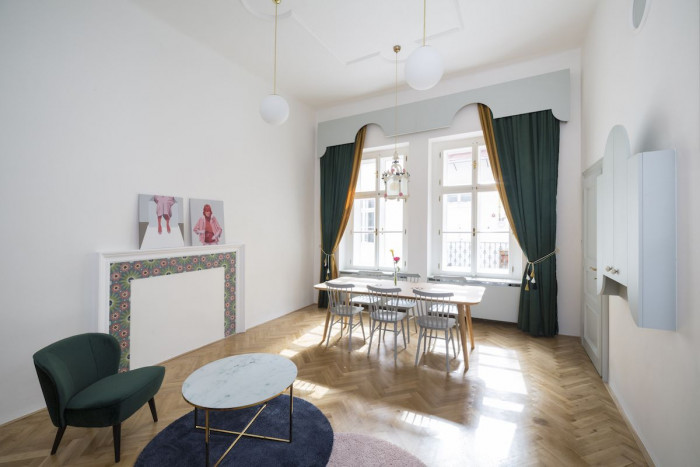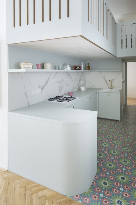 Po Pobřežní třídě na bývalém nábřeží Karlínského přístavu se dnes prohánějí auta právě v místě, kde kdysi kotvily lodě v bočním korytu Vltavy. Ve dvoře jednoho z původních nábřežních domů však ještě dřímá dobová atmosféra prudkého kamenného schodiště, vysokých vídeňských stropů, špaletových oken a družby, před níž není úniku – pavlačí. Tuhle dobovou atmosféru jsme promítli i do kompletní rekonstrukce jednoho z pavlačových bytů.