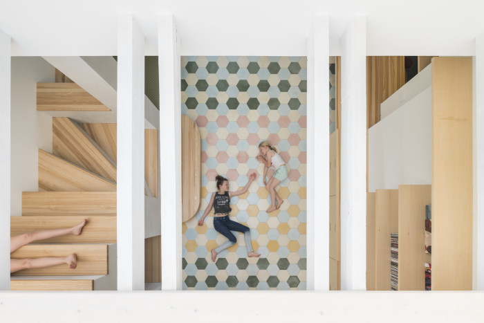 V každém podlaží jsme proto navrhli každé rodině jeden zcela individuální byt i za cenu vícera stoupaček či statických zásahů. Sklep jsme podkopali a prohloubili, abychom zde zřídili společné prostory prádelny, sklepů a technického zázemí, které doplňuje i společná klubovna. Soužití vertikálně propojuje trojice teras nad sebou.