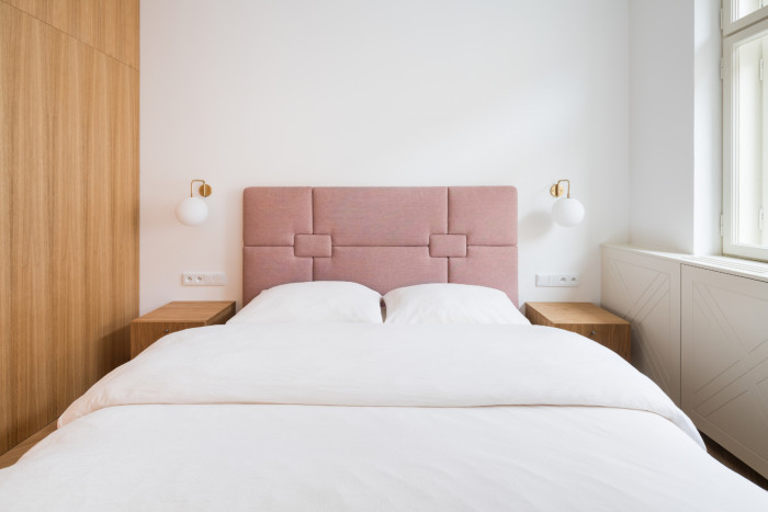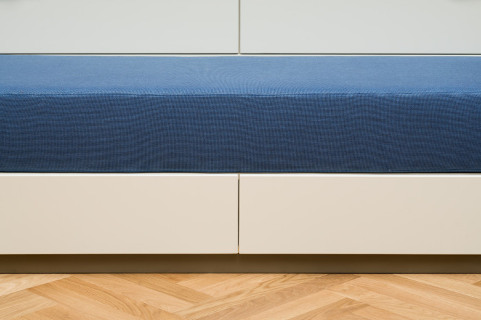 Do tmavé předsíně jsme vložili velkou koupelnu a zatočili příchod do bytu tak, aby nepotřeboval dalšími dveřmi oddělené zádveří, a přece byl zcela oddělen od dění na domovním schodišti. Do interiéru jsme pak v citacích propsali noblesně optimistický ráz domu z unikátní epochy raného 20. století, v jehož útrobách se byt nachází. Fasáda i veřejný interiér domu jsou pojaty s dobovou výtvarnou péčí. Kapotáže topných těles se proto inspirují vzory z domovního zábradlí, špičaté obložky odrážejí okenní štuky, polstrování cituje vzor na domovních dveřích, zatímco v hladkých plochách se stejně jako na jednoduché fasádě domu zdůrazňuje ušlechtilost podstaty – dubových dýh a lakovaných povrchů v jemných odstínech.
