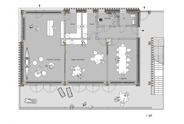 Vstupné podlažie (1. NP) sa už nachádza nad hladinou storočnej vody a okrem vstupu v ňom je umiestnené vodácke centrum, spoločná denná miestnosť pre usporadúvanie akcií a vodácka klubovňa. Technicko-prevádzkové zázemie je tvorené skladom, kuchynkou, wc a kotolňou. Súčasťou podlažia je aj čiastočne prekrytá letná terasa so schodiskom na poschodie/ terénnym schodiskom do spodného hangáru. Horné podlažie (2. NP) je sprístupnené exteriérovým schodiskom a je vyhradené šatniam pre vodákov a verejosť, ku ktorým sú navrhnuté sklady, sušiarne a fitness s prechodom na hornú terasu.