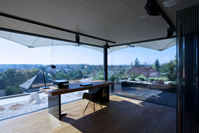 Dům má jedno podzemní podlaží, dvě nadzemní a malou pracovnu umístěnou přímo na střeše. Přízemí domu s obývákem a kuchyní se směrem do ulice uzavírá, naopak do zahrady jej ale otevírá velkorysé prosklení zajišťující maximální propojení interiéru s exteriérem. V patře se pak nacházejí ložnice všech členů rodiny. Půdorysná plocha tohoto podlaží přesahuje přízemí, čímž vytváří kryté prostory terasy a zároveň stíní prosklené plochy přízemí. Střešní pracovnu navrhli architekti tak, aby z domu příliš nevystupovala. Toho dosáhli odsazením hmoty pracovny od hran domu a také jejím provedením z lehké konstrukce.