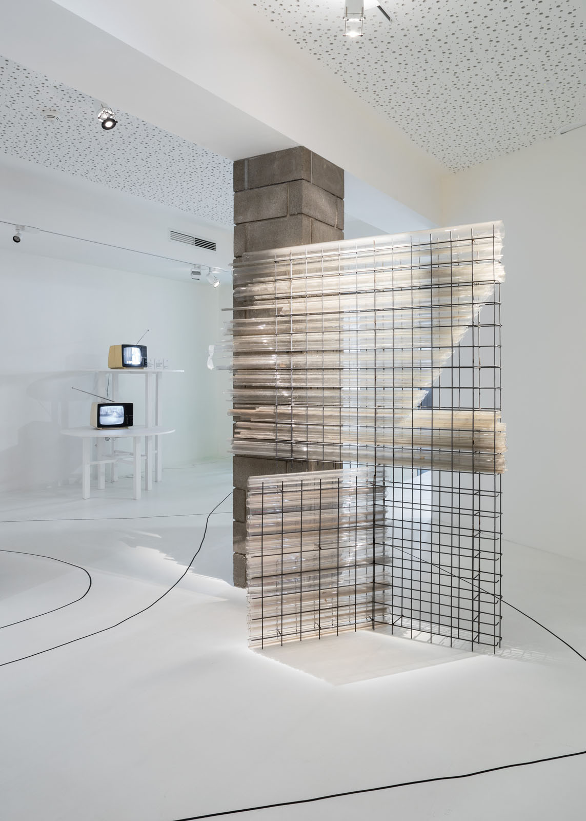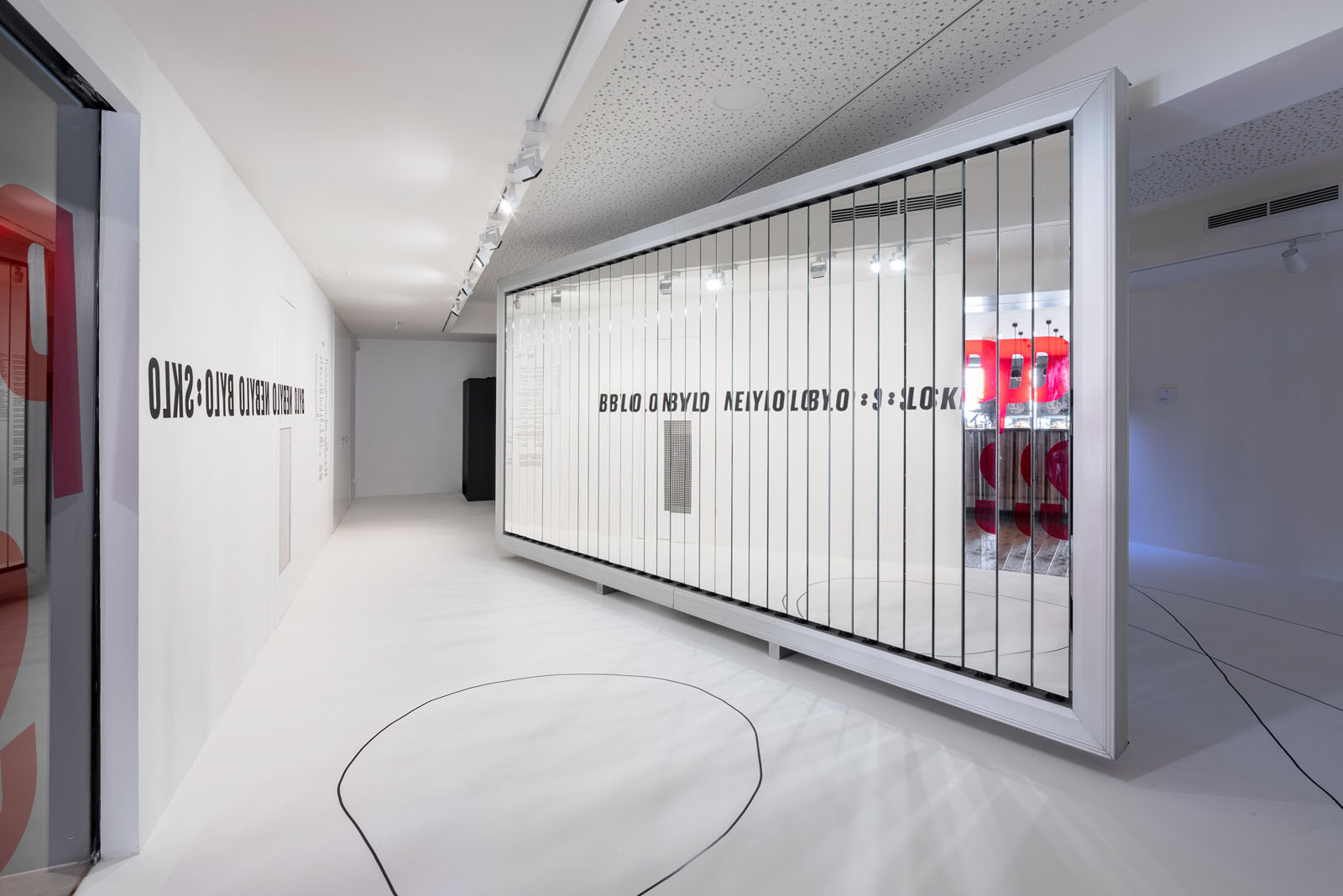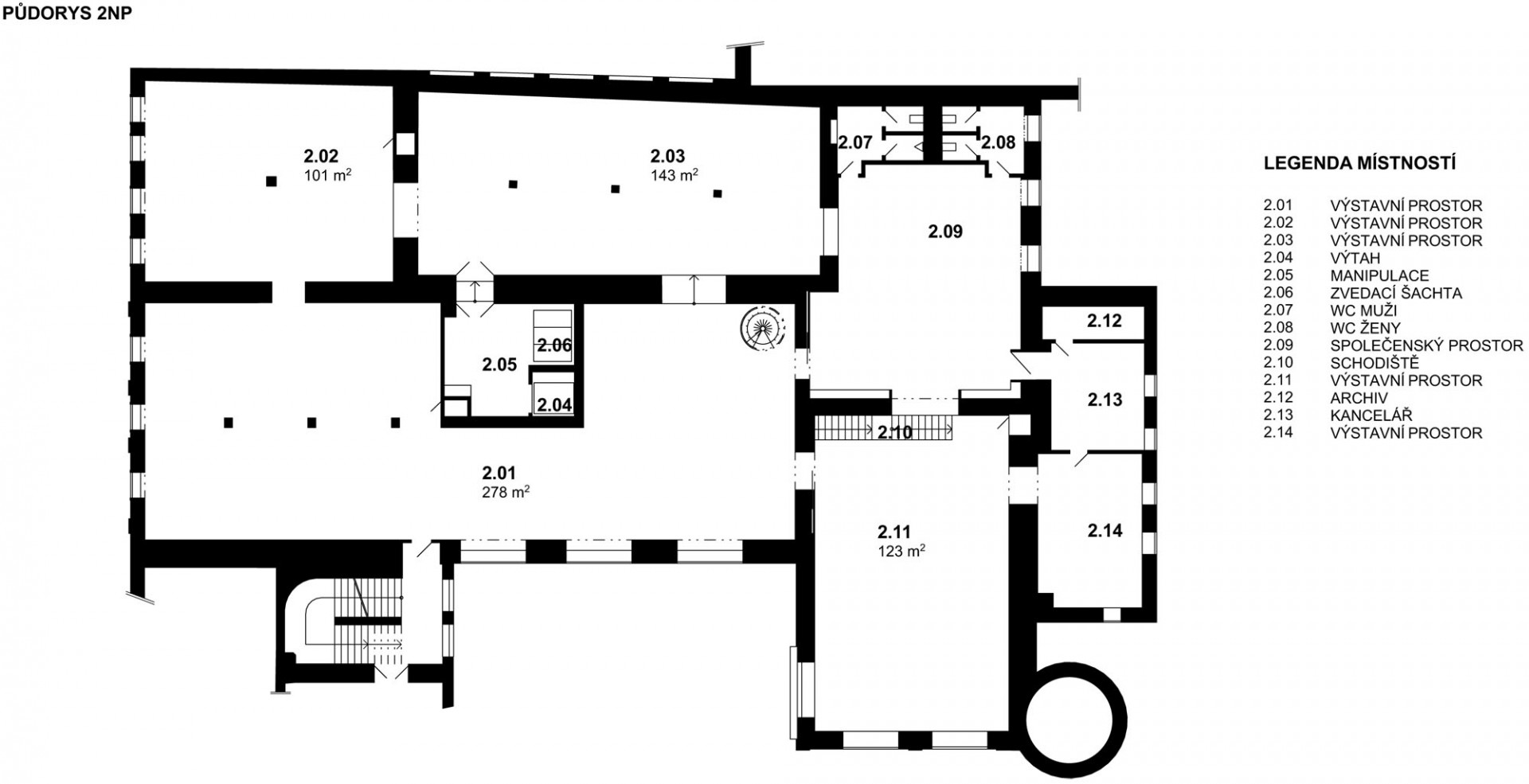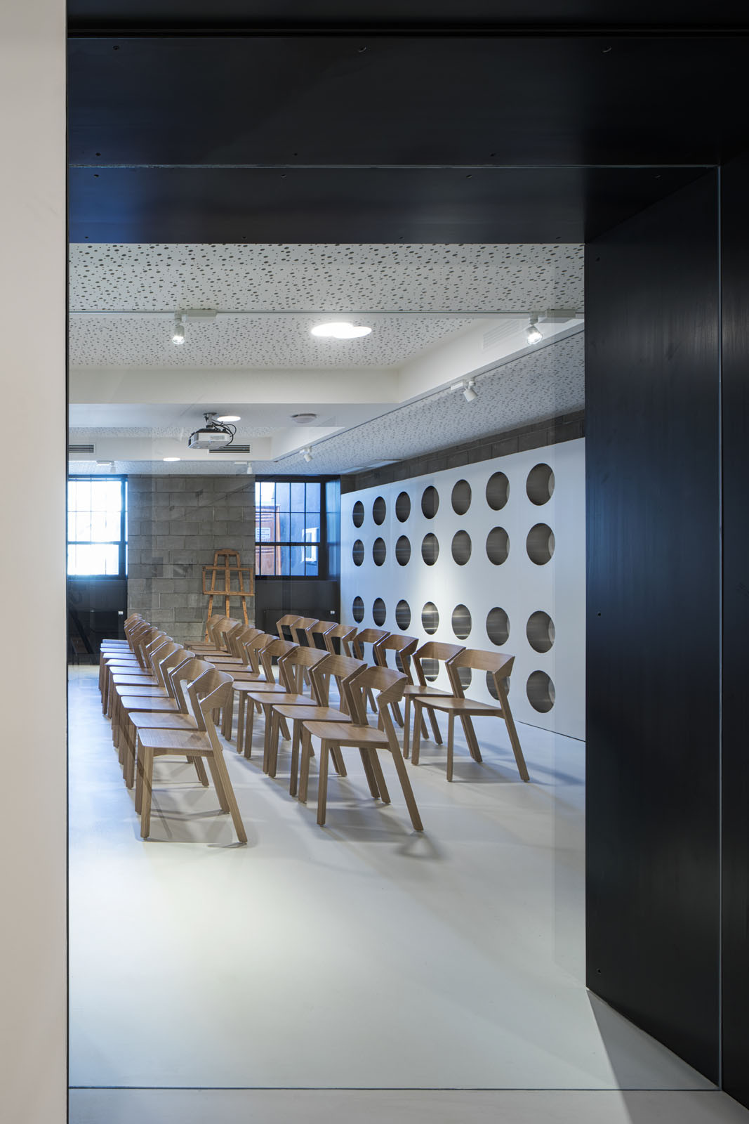 Původně průmyslový charakter budovy se propisuje také do řešení interiéru. Strohému pojetí výstavních prostor v přízemí včetně auditoria a knihkupectví napomáhá sjednocující epoxidová stěrka v bílé barvě. Industriální strohost pak umocňuje ještě přiznané zdivo v šedém odstínu, jako jeden z mála prvků ponechaný z předchozí rekonstrukce v roce 2010.