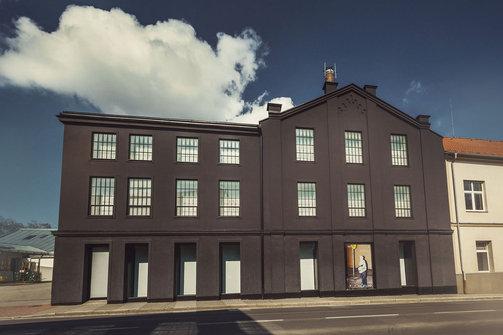 Jedním z požadavků bylo ponechání otvorů oken a zajištění architektonického výrazu budovy, který by objektu navrátil původní charakter fabriky. Architekti navrhli speciální okna s kovovou mříží továrního charakteru s izolačním dvojsklem. Většinu oken v přízemí budovy směrem do ulice tvoří velkoplošné výkladce. Hlavní vstup akcentuje předsazený portál, který nenechává návštěvníky na pochybách, kudy do galerie vstoupit. Čelní část portálu je prosklená a boky tvoří plechové kazety. Velkoplošné zasklení ve vstupní části galerie zároveň propojuje interiér s exteriérem a nabízí tak nahlédnutí do kavárny a bookshopu, které jsou umístěné v přízemí. Okenní rámy vitrín směrem do ulice jsou záměrně potlačeny. Horní a dolní příčky kryje přesah fasádního obkladu, boční sloupky pak zakrývá sklo tónované do černého odstínu. Z exteriéru tak okenní výplň působí jako samostatné sklo.