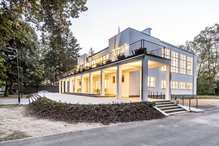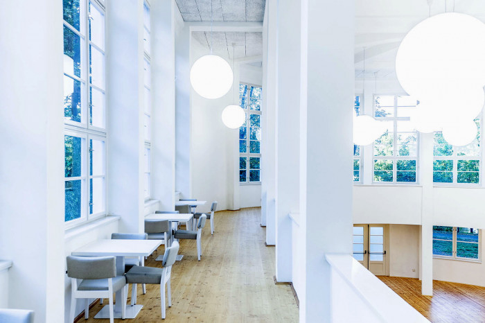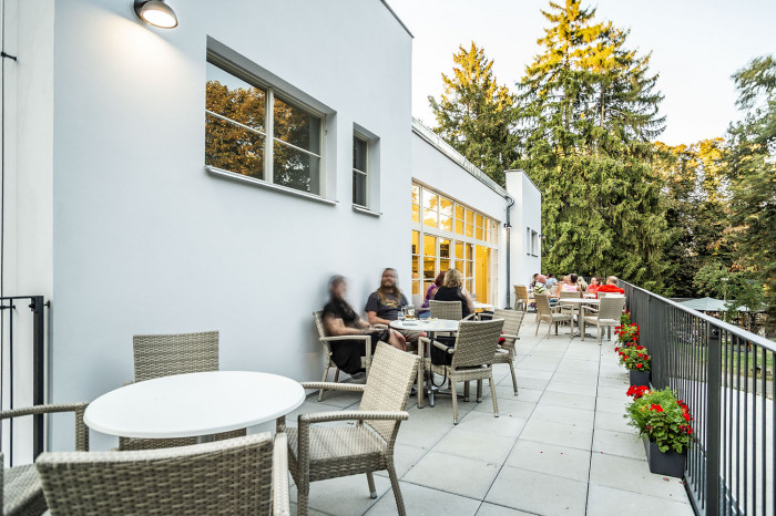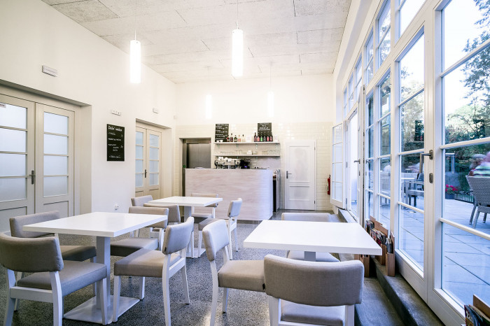 Kavárna v patře je nově srdcem domu, s terasou, nabízející výhled do celého parku. Pro případy kulturních a společenských akcí je ale vybaven i hlavní sál, pro který byly vyrobeny na míru mobilní prvky mobiliáře jako šatní a cateringové pulty a také pojízdné paravány pro příležitostné členění prostoru a zároveň pro instalaci výstav.