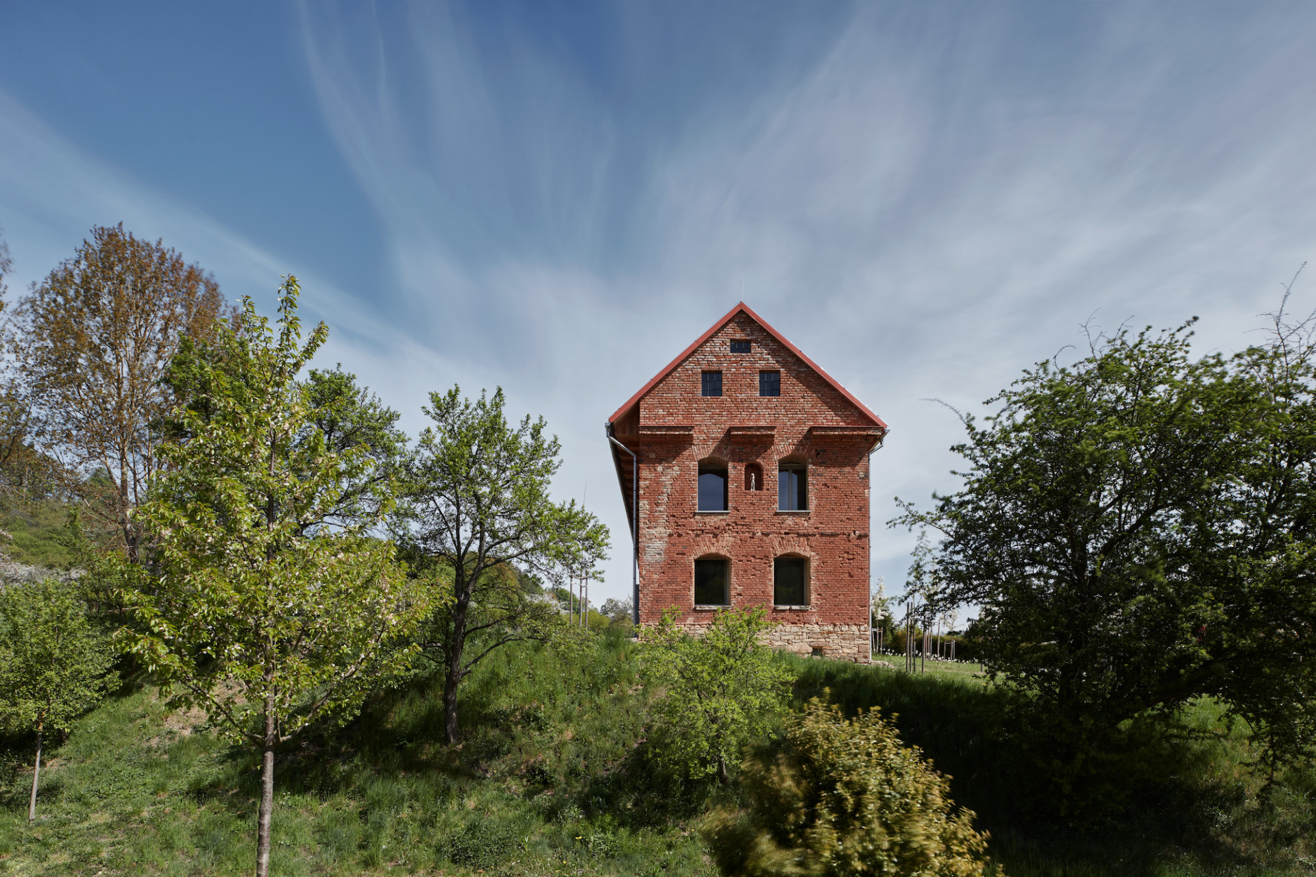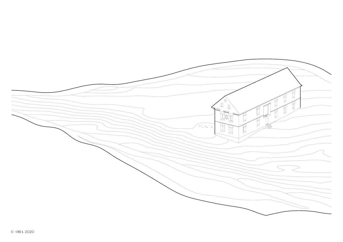 Byli jsme osloveni k projektu rekonstrukce fascinujícího objektu. Našli jsme znásilněný dům, bývalou usedlost, která byla za minulého režimu přestavěna na sýpku. Domu byly vyrabovány jeho vnitřnosti a přeorganizovány pro jiný účel. Po prvním ohledání jsme četli spáry, niky a výstupky a objevovali původní formy. I takhle osekaný dům, dá se říci abstrahovaný, ale neztratil nic ze své velkoleposti. Právě naopak. Způsob, jak je situovaný, jak se vzpíná k nebi a jak jeho syrová hmota odolává času, se ukázaly jako největší kvality. Byla to ruina ohlodaná až na kost. Z původního domu zbyla jen cihelná obálka se střechou. Společně se stavebníky jsme si kladli otázku, zda se máme kam vracet. Při jakékoliv snaze o tradiční opravu bychom o tenhle charakter ruiny přišli. Relativně brzy jsme proto zavrhli spekulativní rekonstrukci původního stavu, i jakékoliv další imitace. Navrhli jsme zafixovat stávající stav romantické ruiny a vstoupit do domu nově.