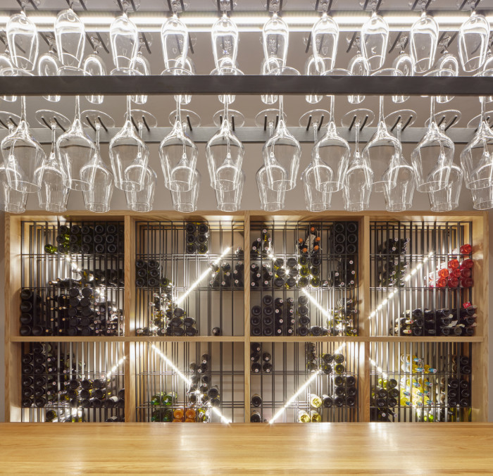 Před pěti lety rekonstrukce začala malým winebarem. Prostor pod dvojicí křížových kleneb je přirozeně členěn na dvě části. U vchodu je posezení pro hosty, s výrazným lustrem ve tvaru kříže a dlouhá lavice. Druhé části dominuje objekt pracovního stolu/baru a fortelný regál na víno.