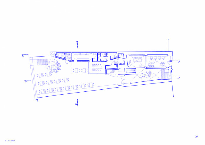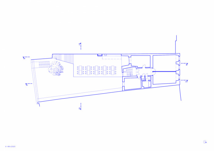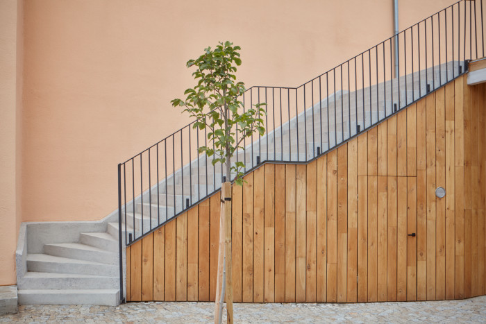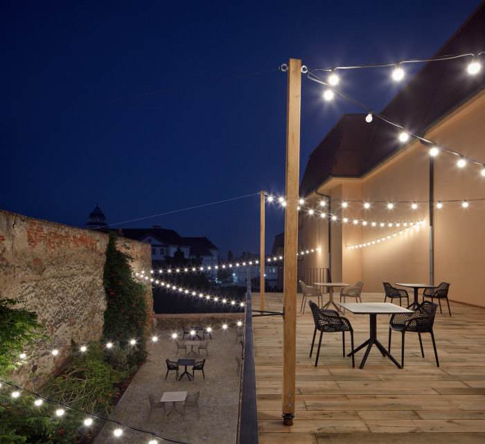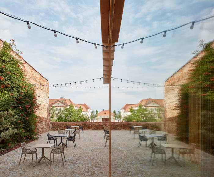 Dvůr je největší kvalitou projektu. Úzký pozemek je situovaný mezi dvojici vysokých zdí. Ta první je kamenná, krásně zvětralá, patřící bývalému kapucínskému klášteru, ta druhá je naopak holá zeď a patří předimenzovanému dlouhodobě nefungujícímu kulturáku z konce 80. let. Zdi rámují nádherný výhled do kapucínské zahrady a na reprezentativní budovu soudu. Výhled jsme ještě podpořili snížením ohradní zdi a demolicí dvorních bud. Provozní nutností bylo navrhnout ve dvoře přístavbu se servisními místnostmi. Rozhodli jsme se přimknout k ošklivé zdi kulturáku a tím jí upozadit a nechat co nejvíce vyniknout klášterní zeď. Přístavba stojí ve stopě bývalého dvorního křídla, které bylo za války zničeno. Po tomto křídle zůstaly jen sklepy, které jsme využili pro výrobní prostory.