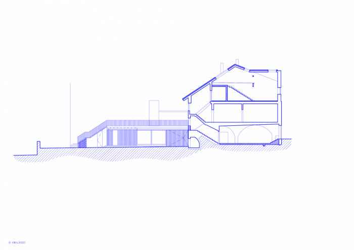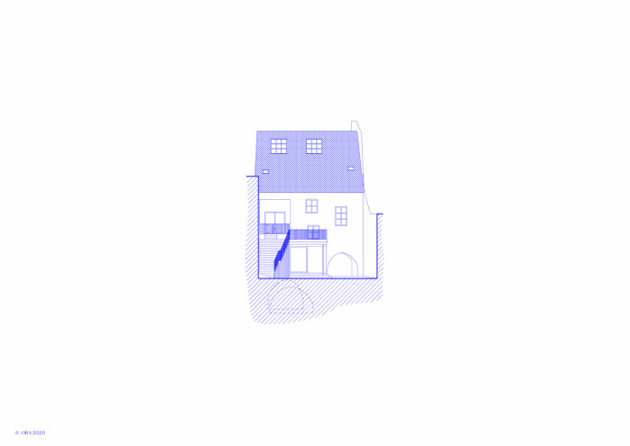 Navrhli jsme pohledům zvenku skrytý soudobý pavilon, jehož střecha je vyhlídkovou terasou a rozšířením prostoru dvora. S dvorem je propojena rozšiřujícím se betonovým schodištěm.