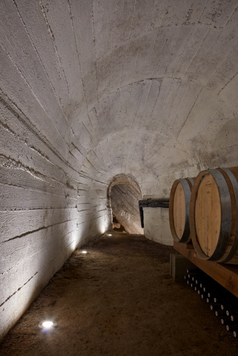 Do sklepů se vstupuje tajnými dveřmi ve fasádě přístavby. Samotnému podzemí zachováváme jeho autenticitu záměrně téměř bez zásahu. Sklepy v první úrovni jsou napěchovány nerezovými tanky, zde se nachází hlavní výrobní prostory vinařství. Ve druhém patře sklepů jsou umístěny sudy. Na tuto část přímo navazuje znojemské historické podzemí.
