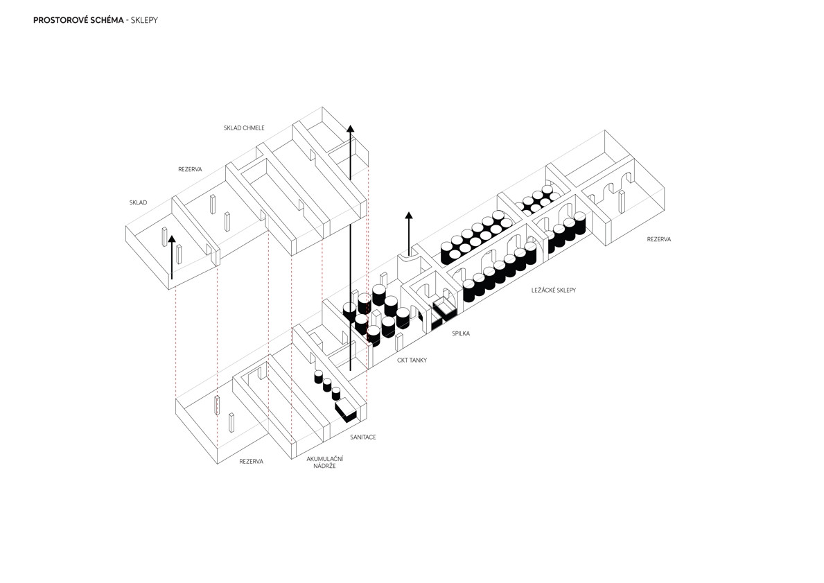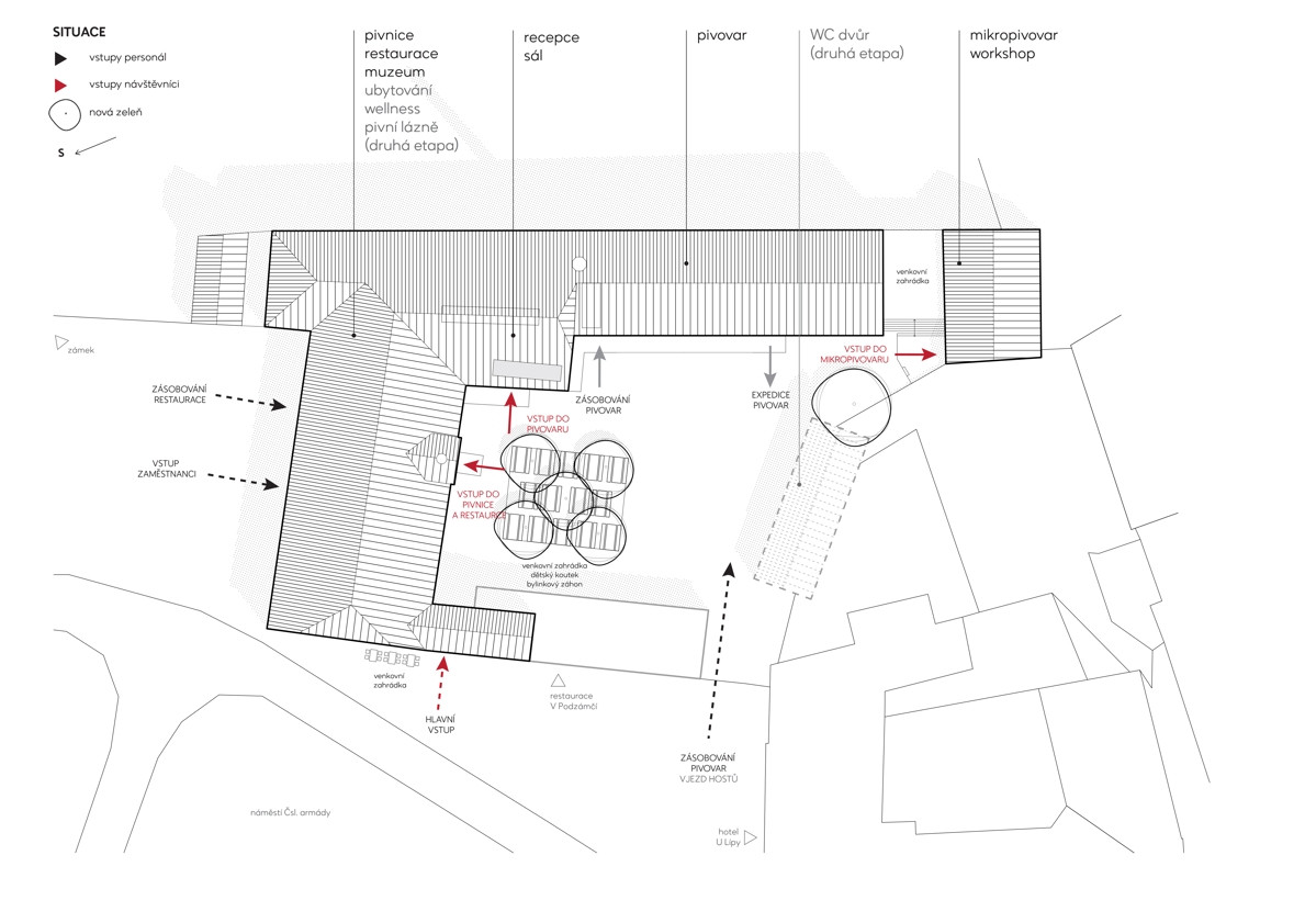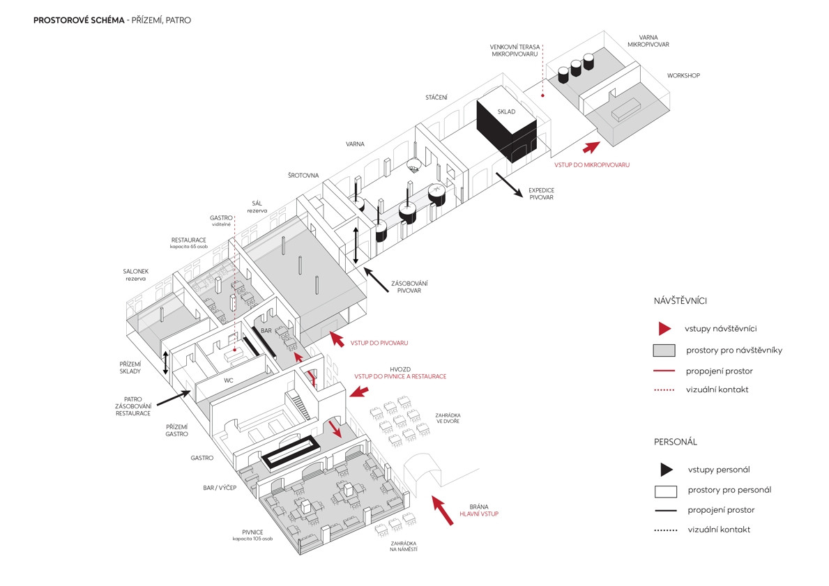 Klíčové provozy pivovaru umisťujeme v rámci stavby tak, aby byly otevřeny do veřejných prostor a zatraktivnily tak celé nejbližší okolí. Pivnici směrujeme do náměstí a novými okny propojujeme s pivovarským dvorem. Ve varně, po obnově původního velkorysého prosklení, vzniká atraktivní průhled z náměstí skrz pivovarský dvůr až do zámeckého parku. Veškerá provozní a technická zázemí jsou skrytá v prostorách sklepů a podkrovích.