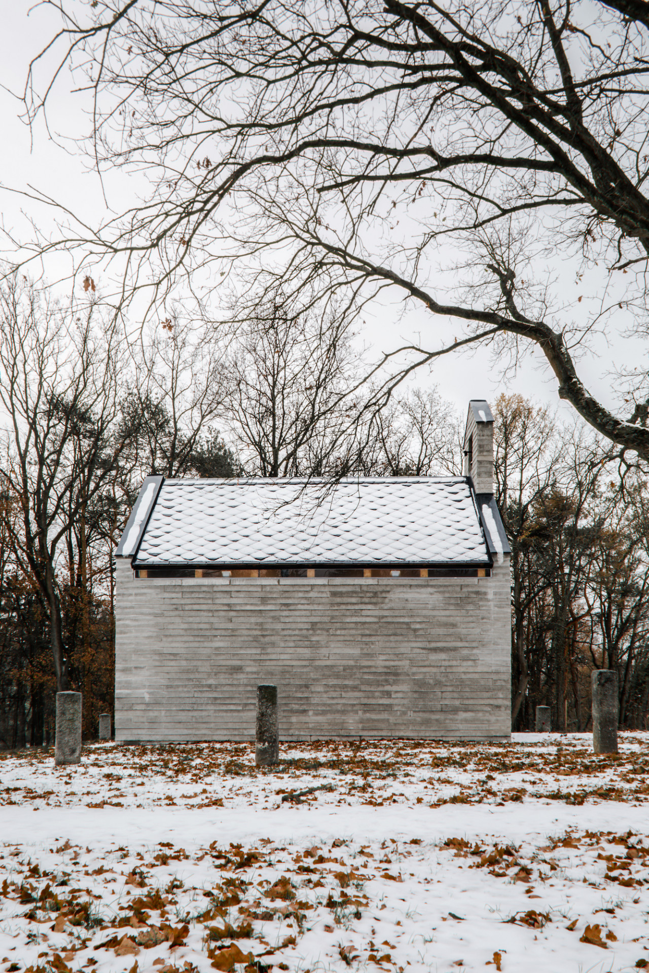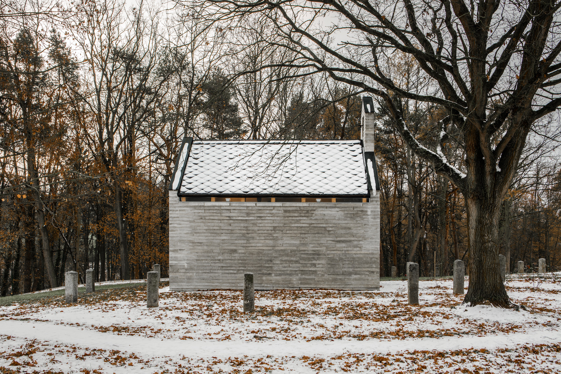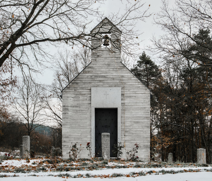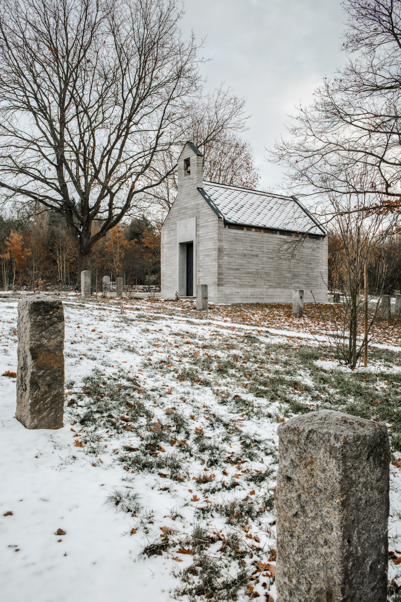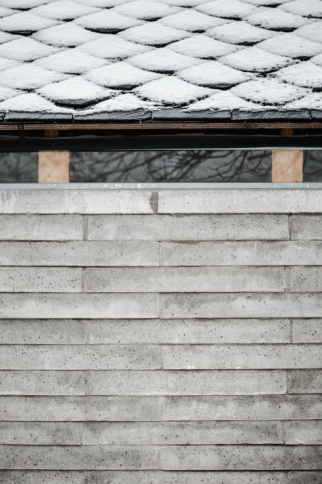 Kaple balancuje mezi tradicí a současnými stavebními principy. Jednoduchou hmotu jsme načlenili pásem oken nad bočními stěnami, kde bychom v tradičním pojetí tvořili římsu. Obdobně jsme hledali rovnováhu i v materiálech. Břidlicovou krytinu, žulová ostění a trámový krov jsme doplnili o betonové bloky, které byly ručně vyráběny na místě, přímo v modulu kaple. Bloky v rozměru 80x40x10cm z prostého betonu jsou na delších stranách směrem k podstavě rozšířeny, čímž se výrazněji propisují jednotlivé vrstvy. Tím vzniká charakteristický vzhled zdiva a jde tak o hlavní zdobný prvek stavby.