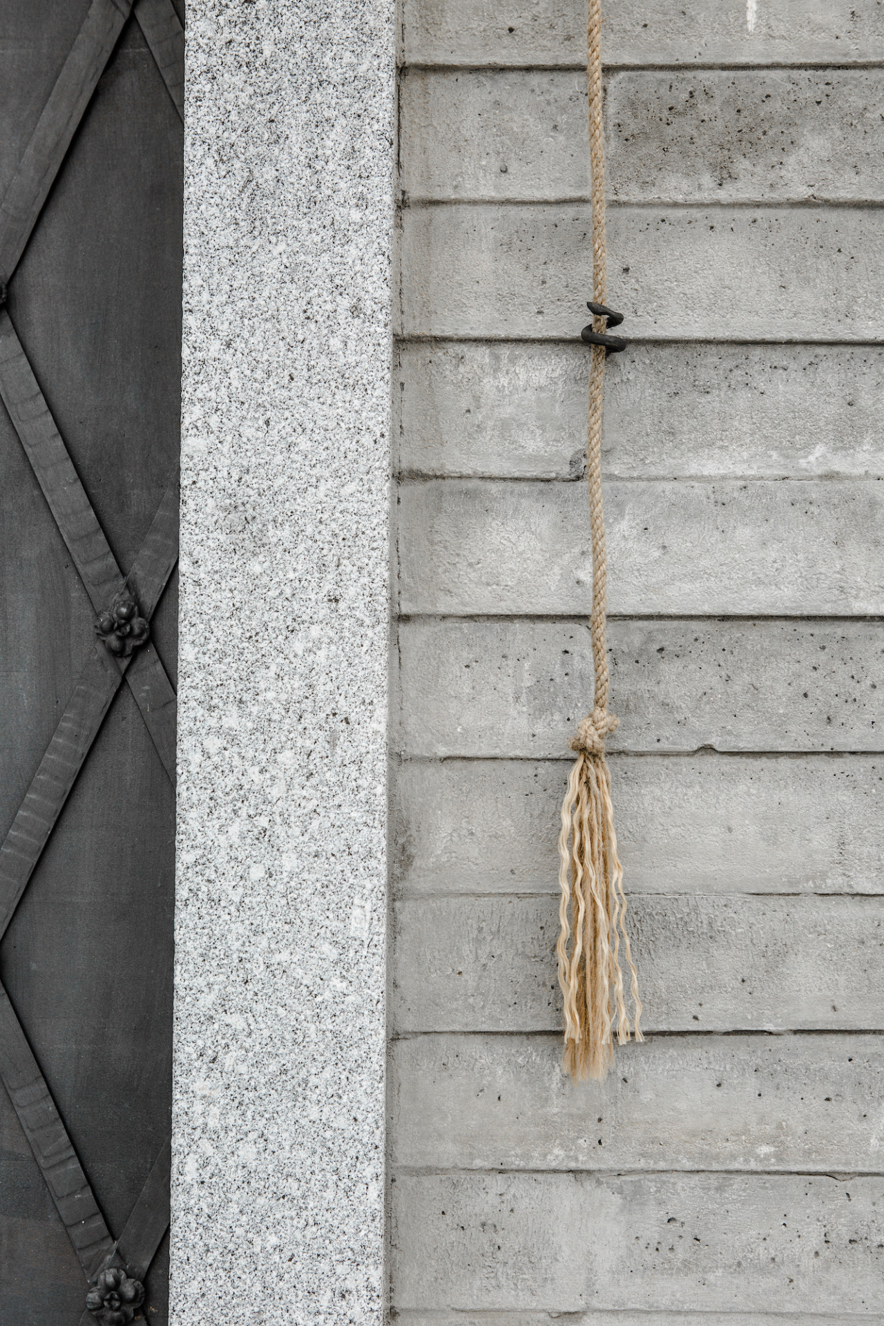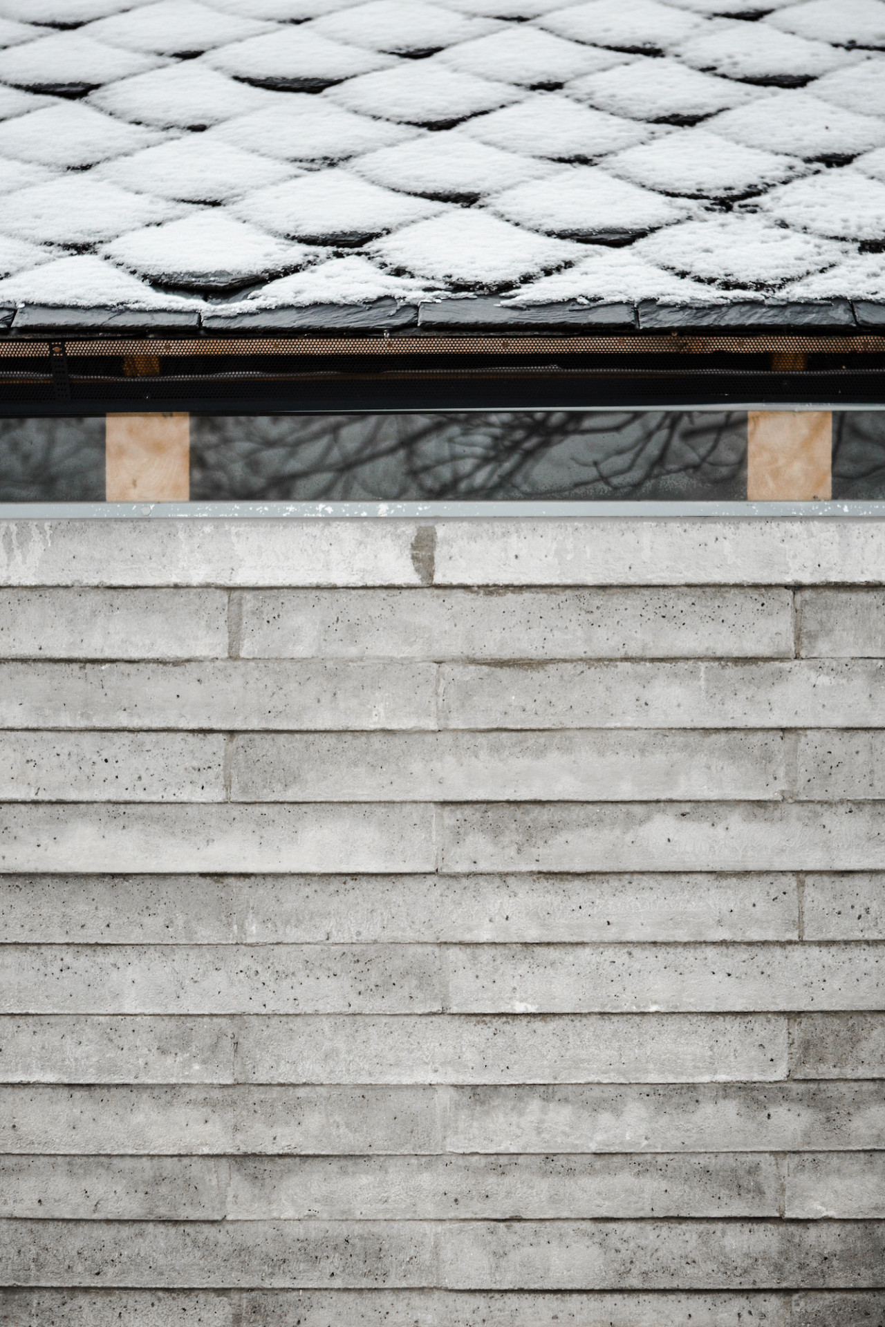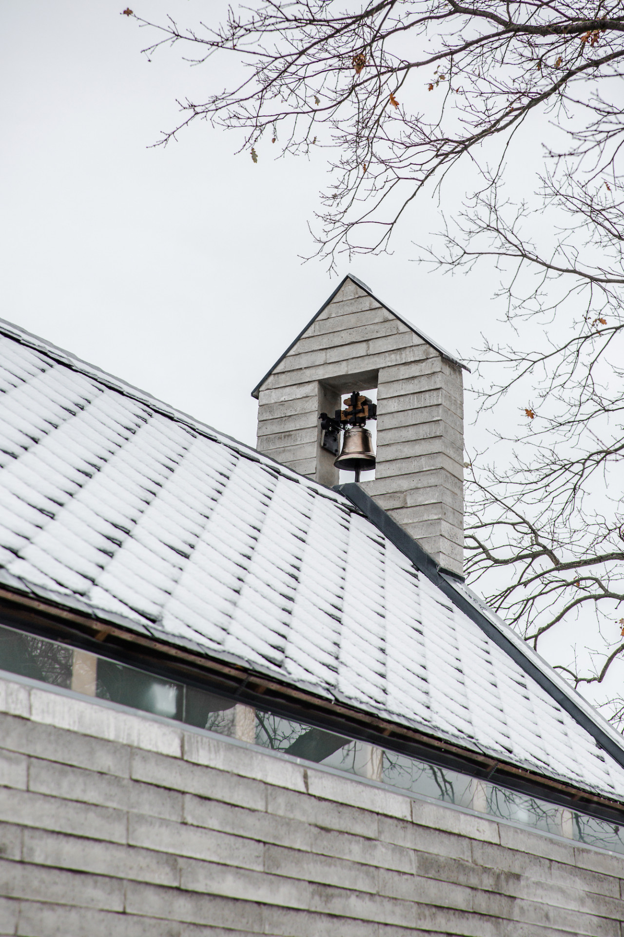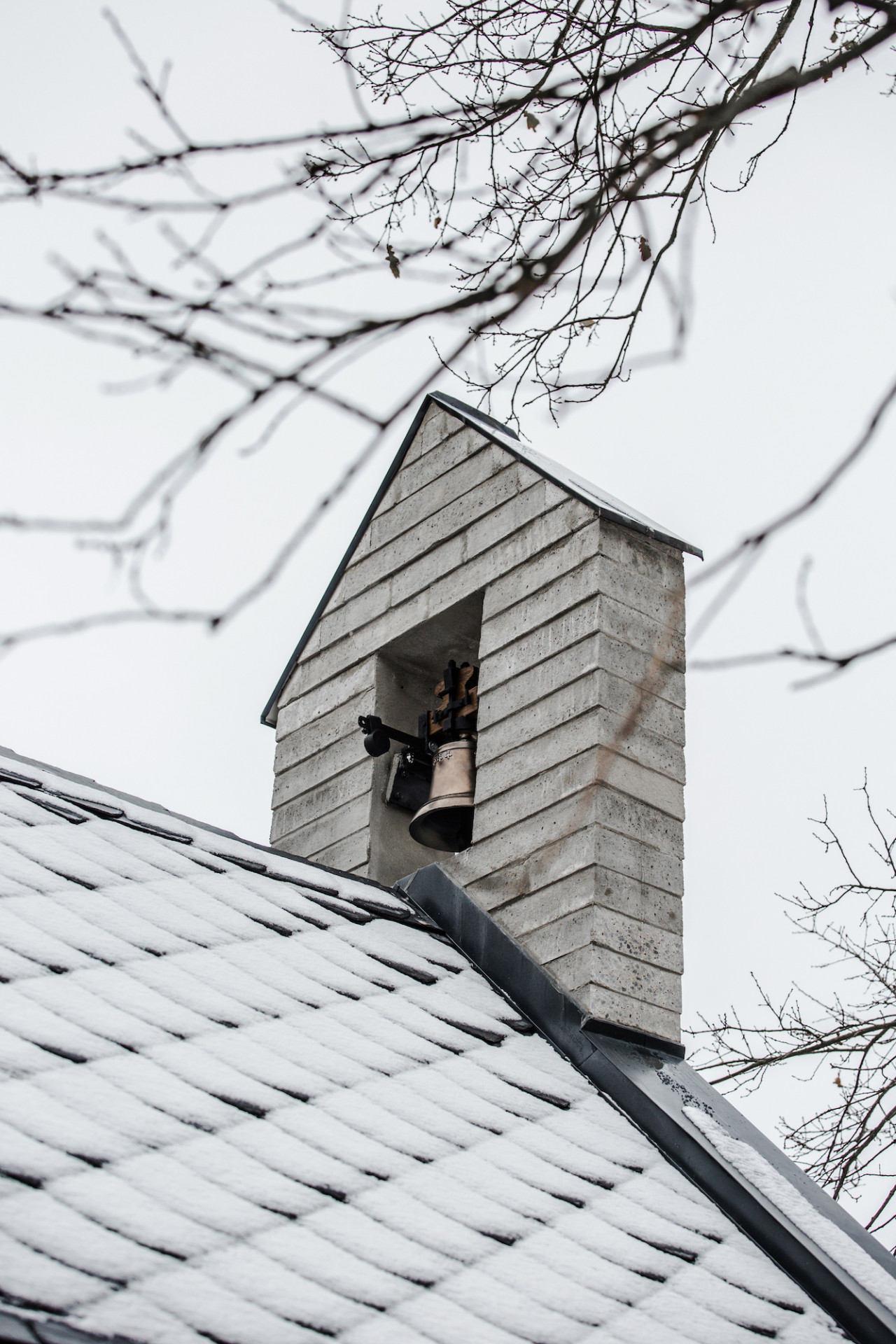 Kaple balancuje mezi tradicí a současnými stavebními principy. Jednoduchou hmotu jsme načlenili pásem oken nad bočními stěnami, kde bychom v tradičním pojetí tvořili římsu. Obdobně jsme hledali rovnováhu i v materiálech. Břidlicovou krytinu, žulová ostění a trámový krov jsme doplnili o betonové bloky, které byly ručně vyráběny na místě, přímo v modulu kaple. Bloky v rozměru 80x40x10cm z prostého betonu jsou na delších stranách směrem k podstavě rozšířeny, čímž se výrazněji propisují jednotlivé vrstvy. Tím vzniká charakteristický vzhled zdiva a jde tak o hlavní zdobný prvek stavby.