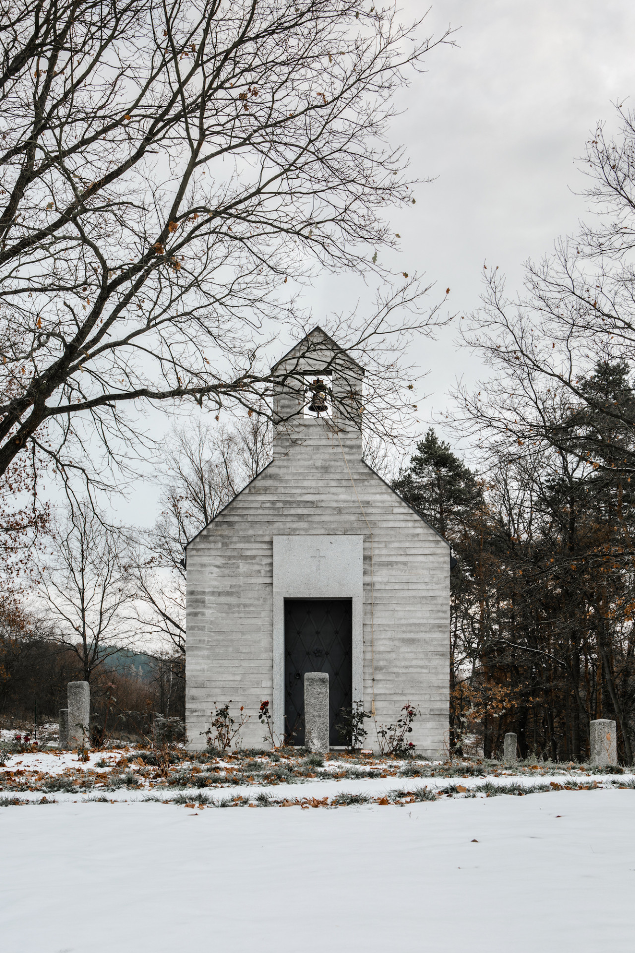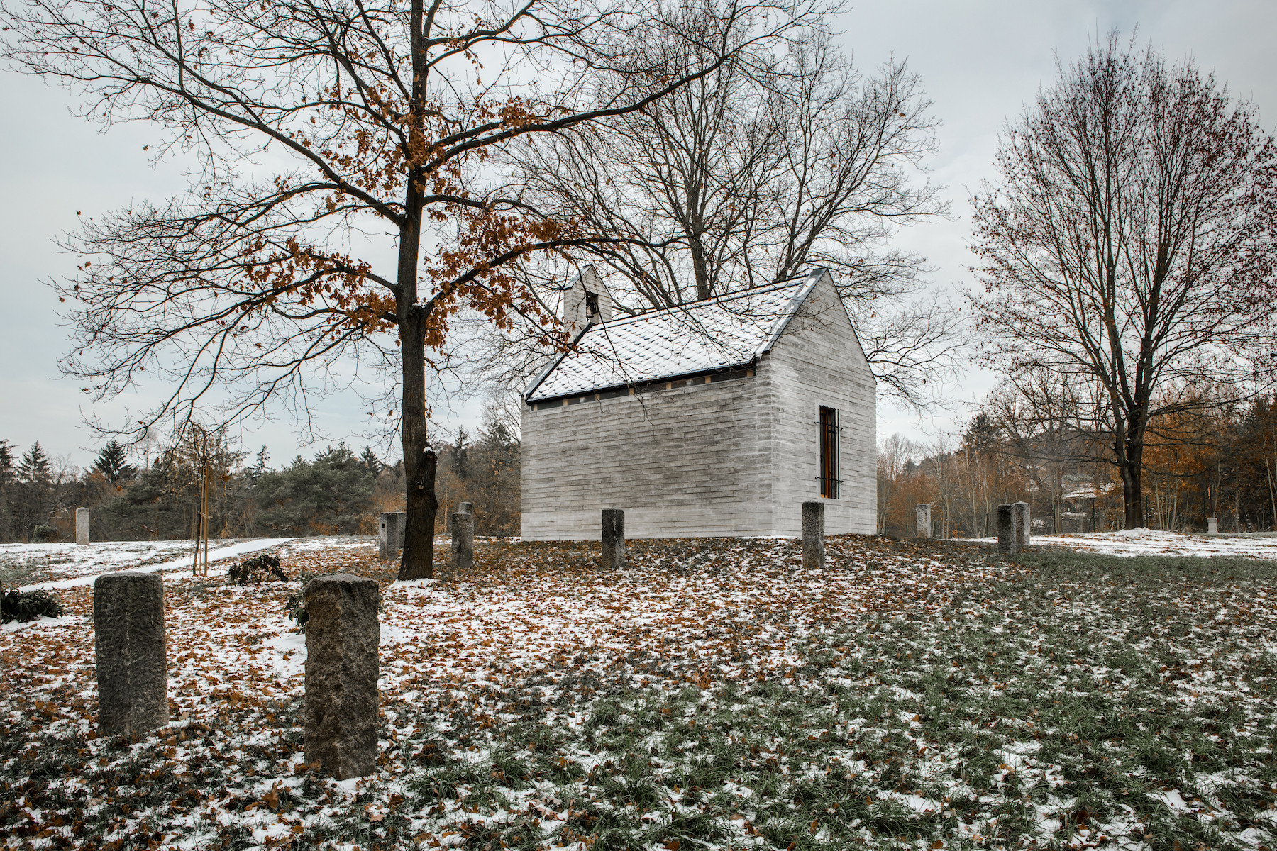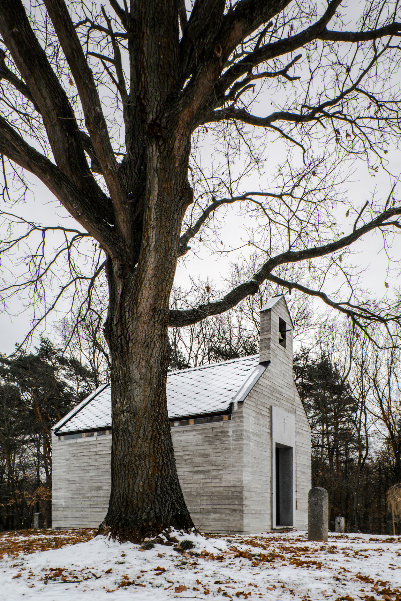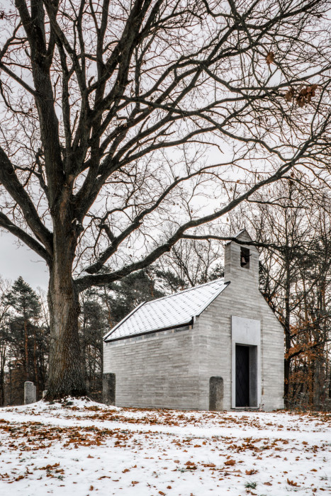 Nevšední a citlivé zadání. Tím pro nás začala práce na návrhu soukromé kaple, uvažované pro rodinu a nejbližší přátele investora. Kaple stojí na soukromém pozemku, v jejím umístění mezi vzrostlými opadavými duby měl stavitel od počátku jasno. Je orientována v ose východ-západ, vstupem se obrací směrem k obci. Tvarování stavby vychází z myšlenek, které její vznik iniciovaly. Investor vyrůstal v Řecku, základní archetyp se zvonicí v průčelí mu byl blízký. Tento model jsme doplnili o přístupy z českého prostředí.