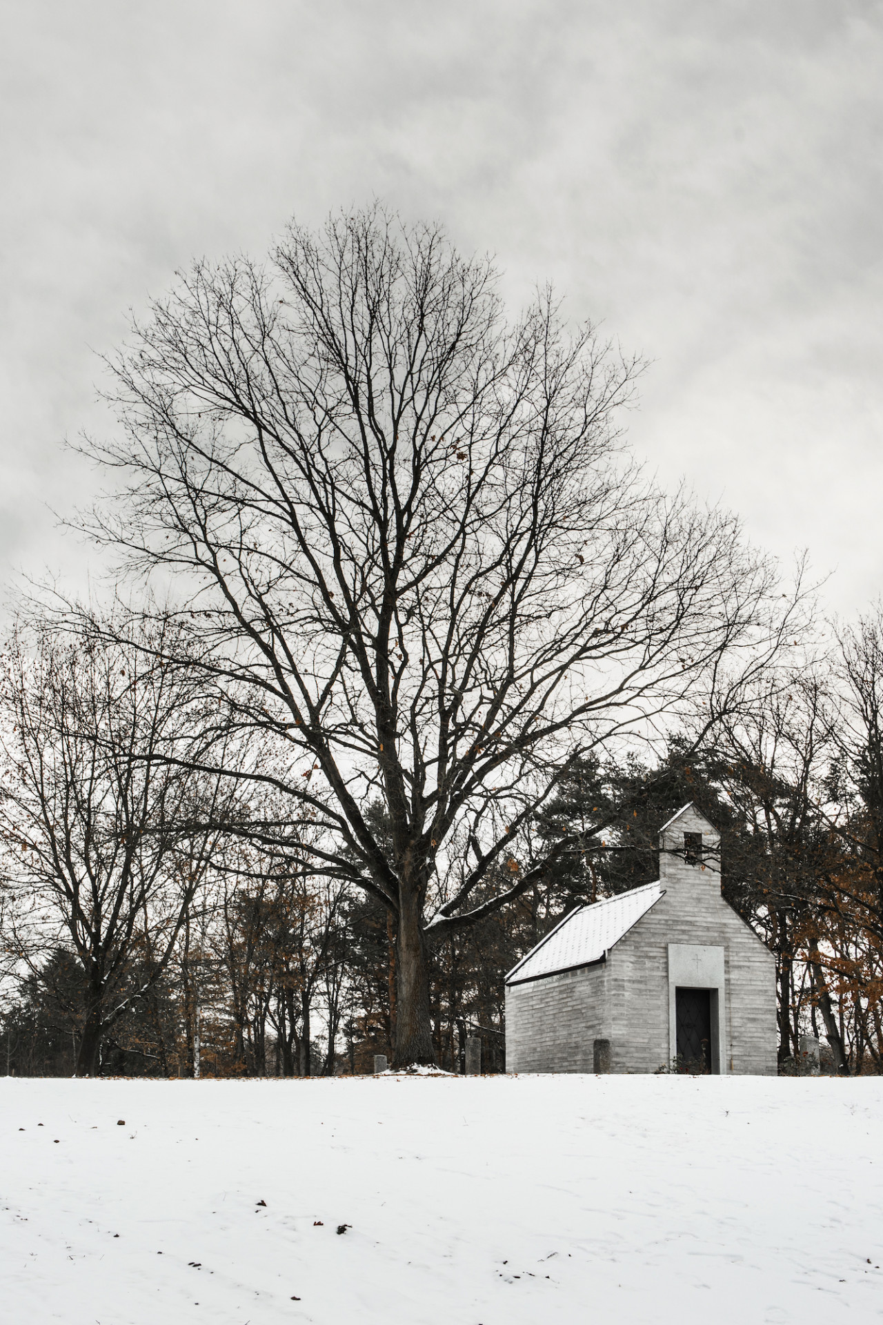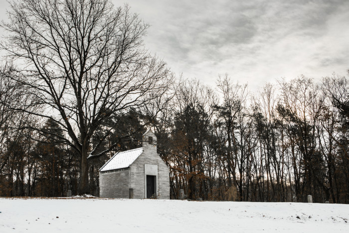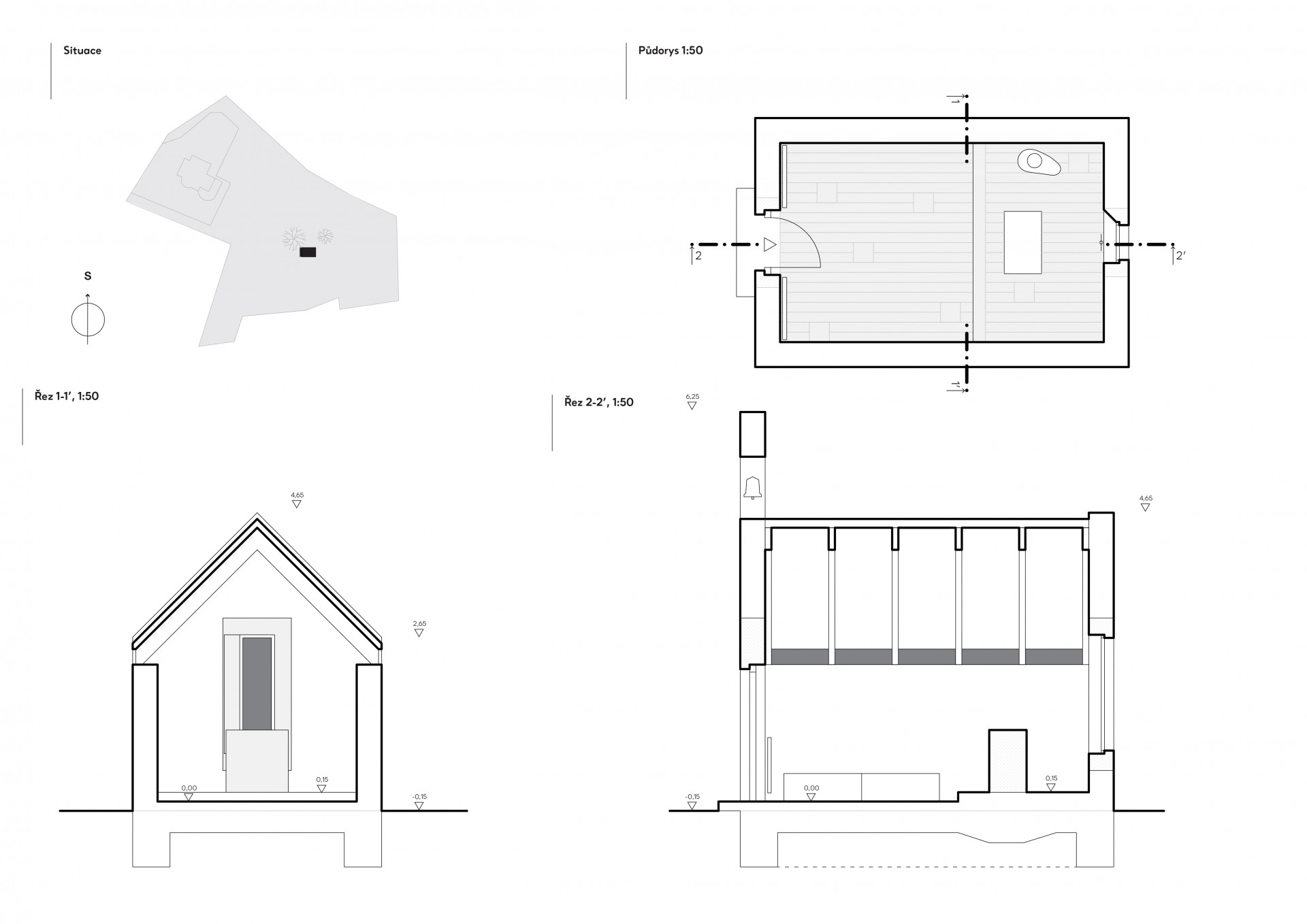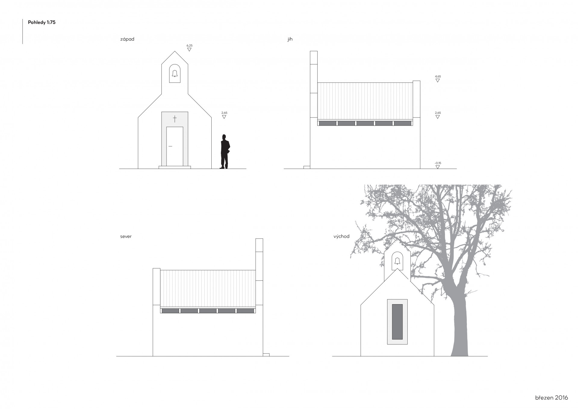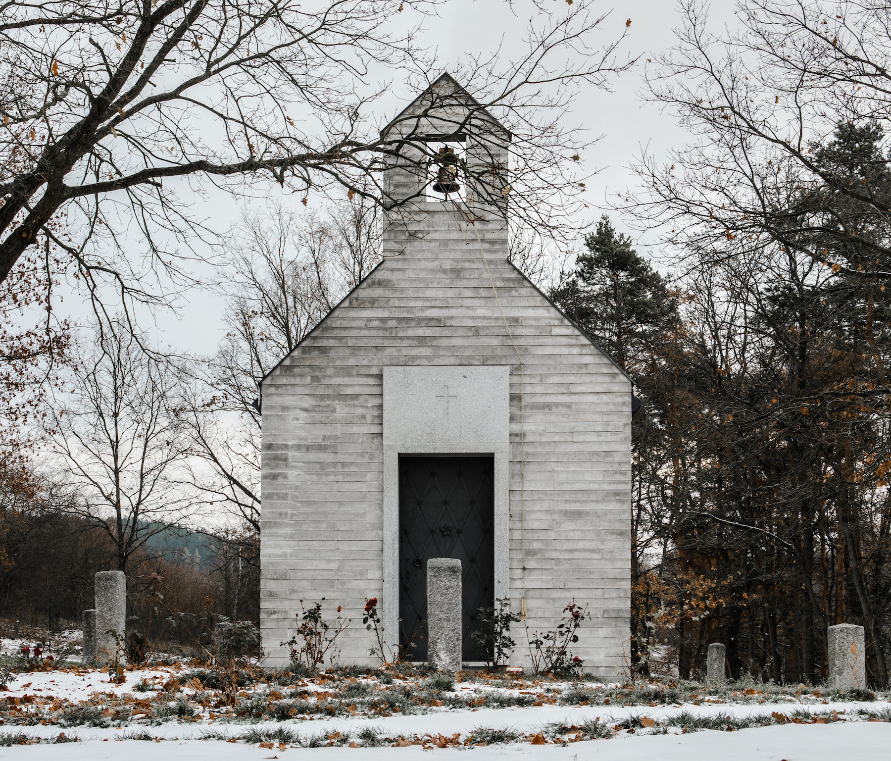 Nevšední a citlivé zadání. Tím pro nás začala práce na návrhu soukromé kaple, uvažované pro rodinu a nejbližší přátele investora. Kaple stojí na soukromém pozemku, v jejím umístění mezi vzrostlými opadavými duby měl stavitel od počátku jasno. Je orientována v ose východ-západ, vstupem se obrací směrem k obci. Tvarování stavby vychází z myšlenek, které její vznik iniciovaly. Investor vyrůstal v Řecku, základní archetyp se zvonicí v průčelí mu byl blízký. Tento model jsme doplnili o přístupy z českého prostředí.