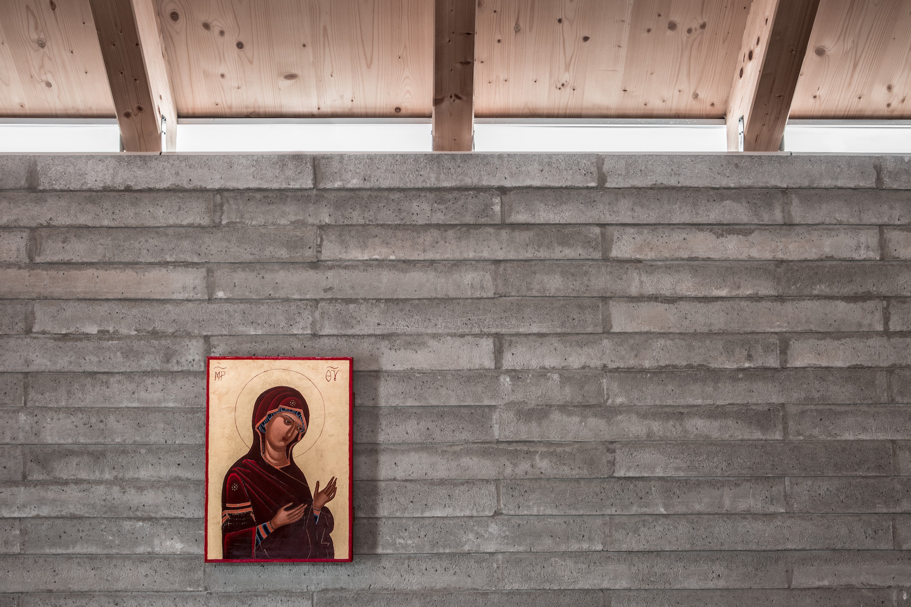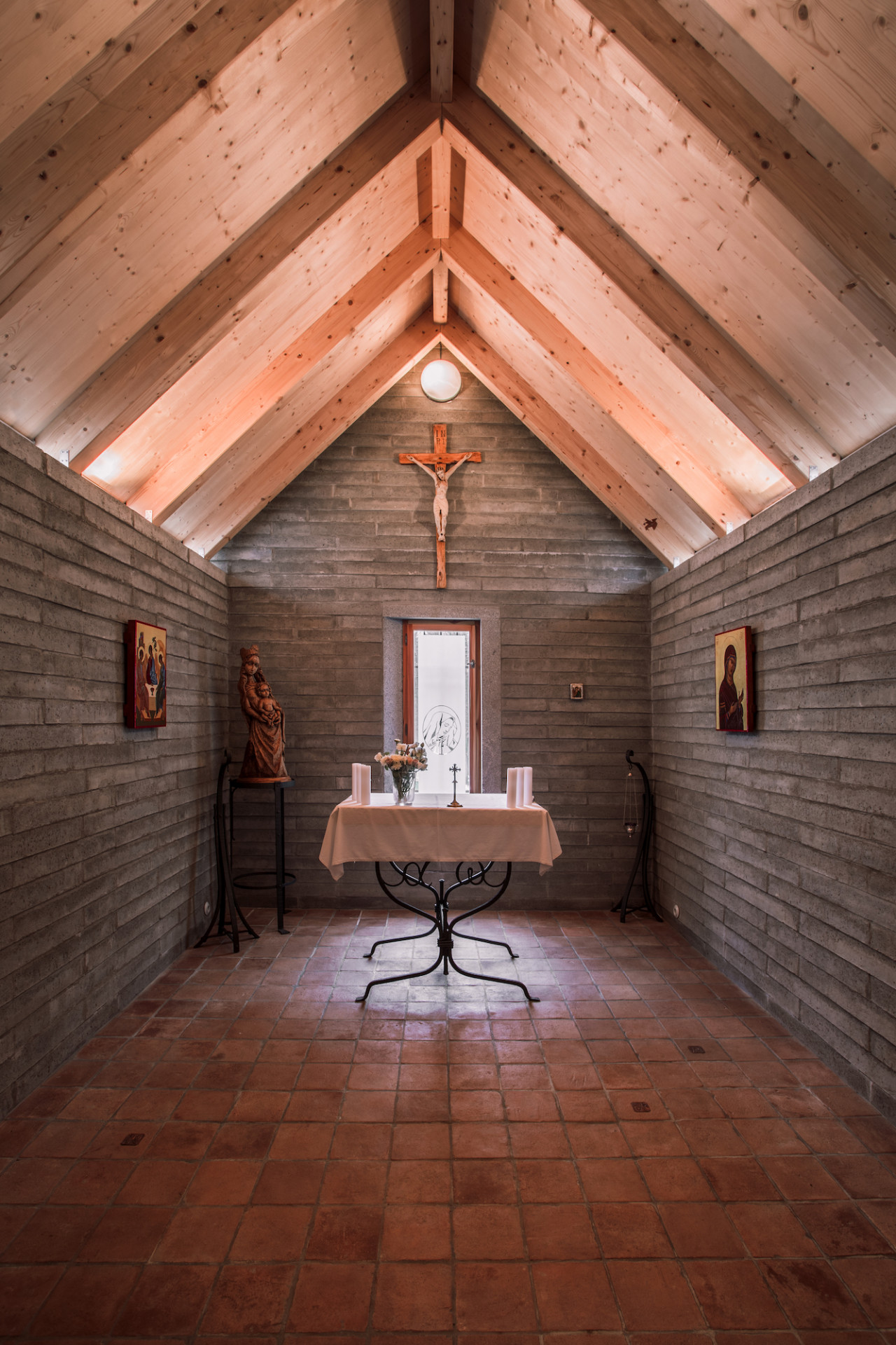 V interieru je kaple opět zcela prostá. Základní materiály doplňují pouze ikony z cest rodiny a mobiliář tvořený lokálními řemeslníky.