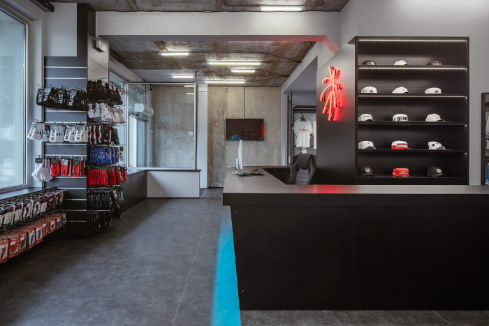 Obchod se sportovním vybavením BasketSHOP má novou prodejnu v jednom z libeňských paneláků. Jeho vzhled vychází z estetiky ulice a důležitou roli v něm hrají odstíny šedé a černé doplněné o zářivé LED osvětlení a červené neony. Stěny a strop jsou odhalené až na betonovou konstrukci, která vytváří hlavní estetický prvek. Na stropě jsou přiznané technické rozvody osvětlení a vzduchotechniky umocňující industriální charakter. Dominantním materiálem je ocel použitá v několika formách v rámci regálového systému, a především na prodejním pultu. Neutrální tóny umožňují vyniknout pestrobarevné paletě nabízeného sortimentu a přitáhnout pozornost zákazníka. Regály jsou, stejně jako pult, podsvíceny LED páskami, aby podtrhly jejich tvarovou linii a jako navigační prvek provázely zákazníka po celém prostoru.