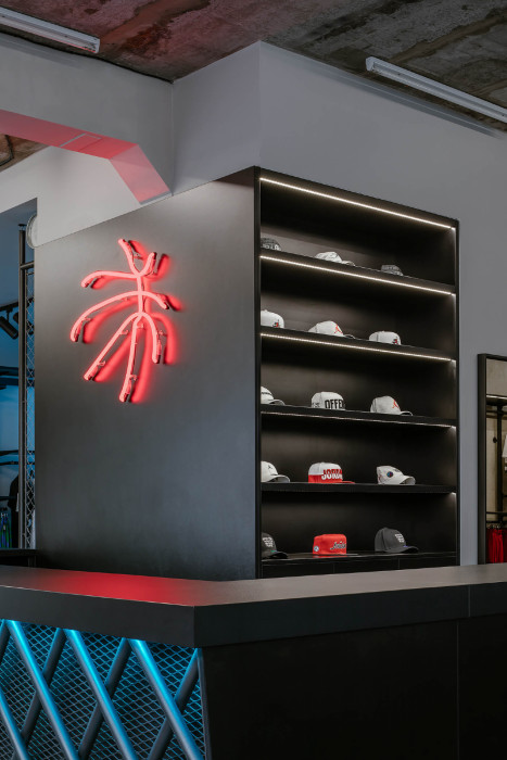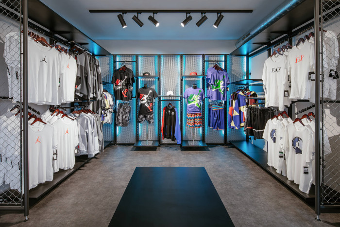 Kultura basketbalu je spojována i s pouliční hrou, proto se architekti zaměřili na práci s betonem a přiznanými industriálními prvky s cílem plynule propojit interiér obchodu s okolními ulicemi. To se podařilo díky zakomponování citlivých a promyšlených detailů ve spojitosti s velkoformátovými okny. Ta jsou umístěna přes celou šíří obchodu a interiér se stává výlohou, která zve k prozkoumání. Díky spojení designu s praktickým využitím je nakupování nejen pohodlné, ale stává se z něj zážitek.