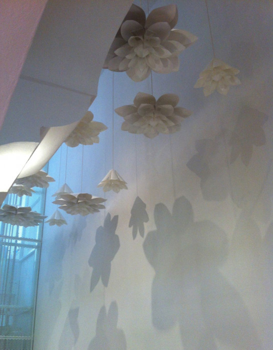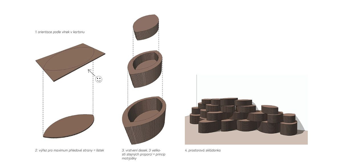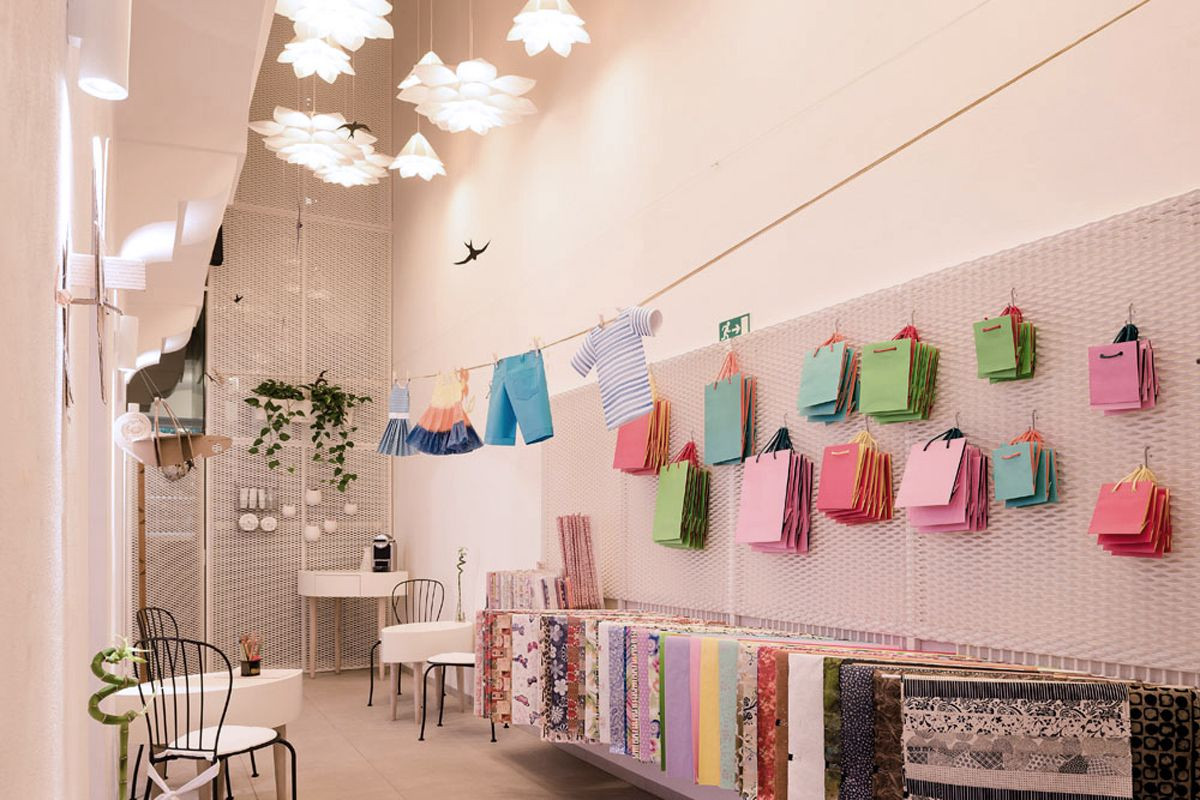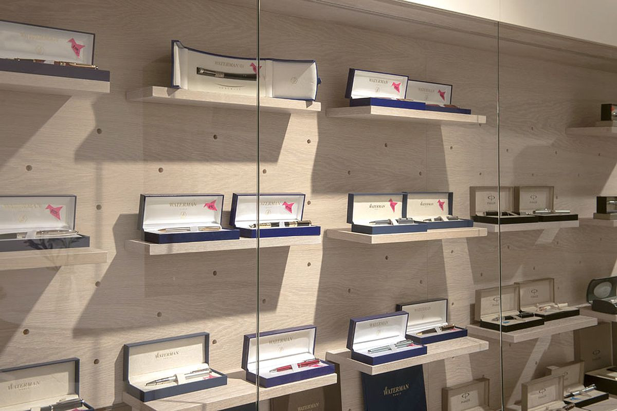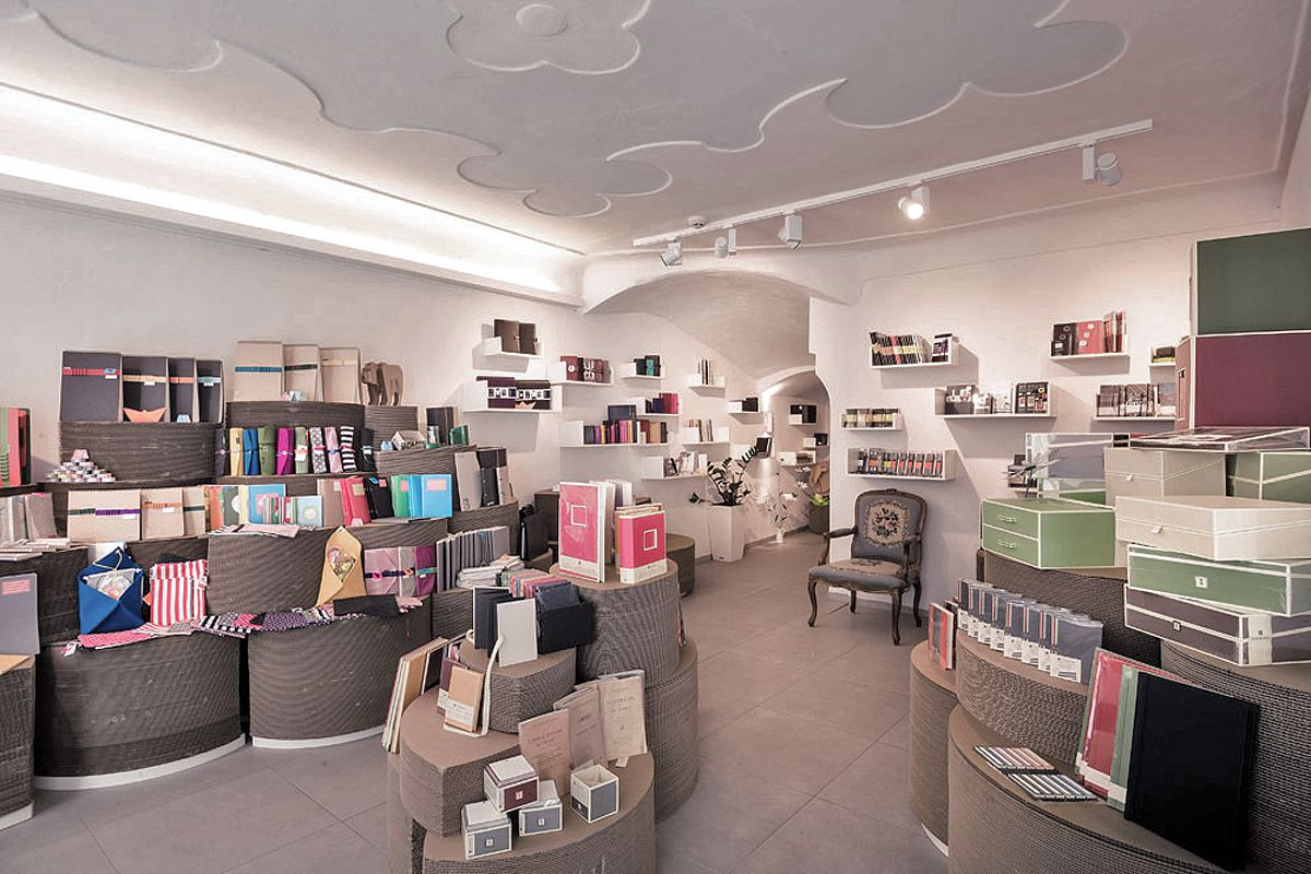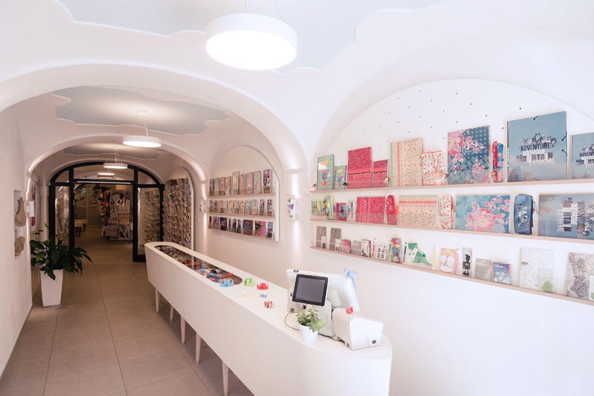 Přední místnost vedle průchodu má díky rozšířeným a čistě zaskleným výkladcům maximální kontakt s ulicí a slouží pro vystavení nejzajímavějšího zboží skoro jako v galerii. Pro jeho expozici jsme navrhli flexibilní stavebnicový systém z kartonu, který si firma dokázala vyrobit sama ve své kartonáži. Pro úsporu materiálu do sebe tři velikosti lístků zapadají na principu matrjošky.