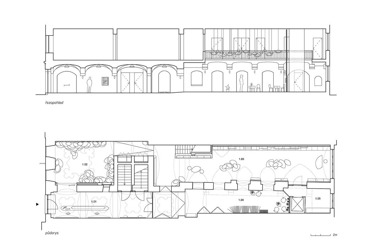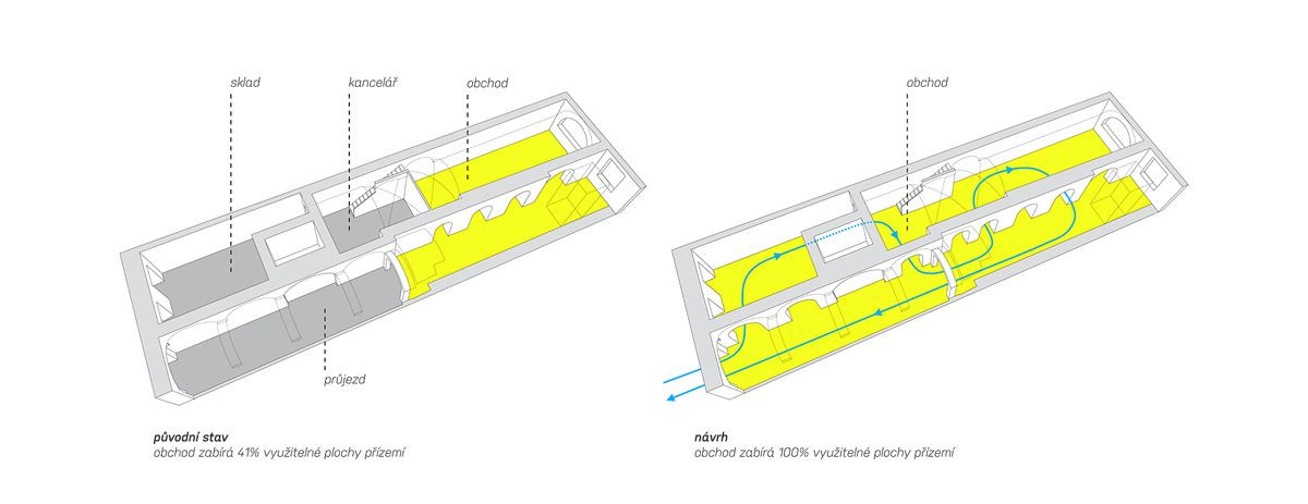 Přestože původní zadání zahrnovalo pouze stávající prodejnu a změnu jejího interiéru, přesvědčili jsme majitele, že pro dosažení maximálního efektu má smysl upravit celé přízemí domu. Jeho dispozice totiž představovala naprostý opak klasického obchodního schématu - podél uliční fasády se nacházel sklad, zatímco prodejna samotná byla až v zadní části domu, kam zákazník musel projít tmavým průchodem.