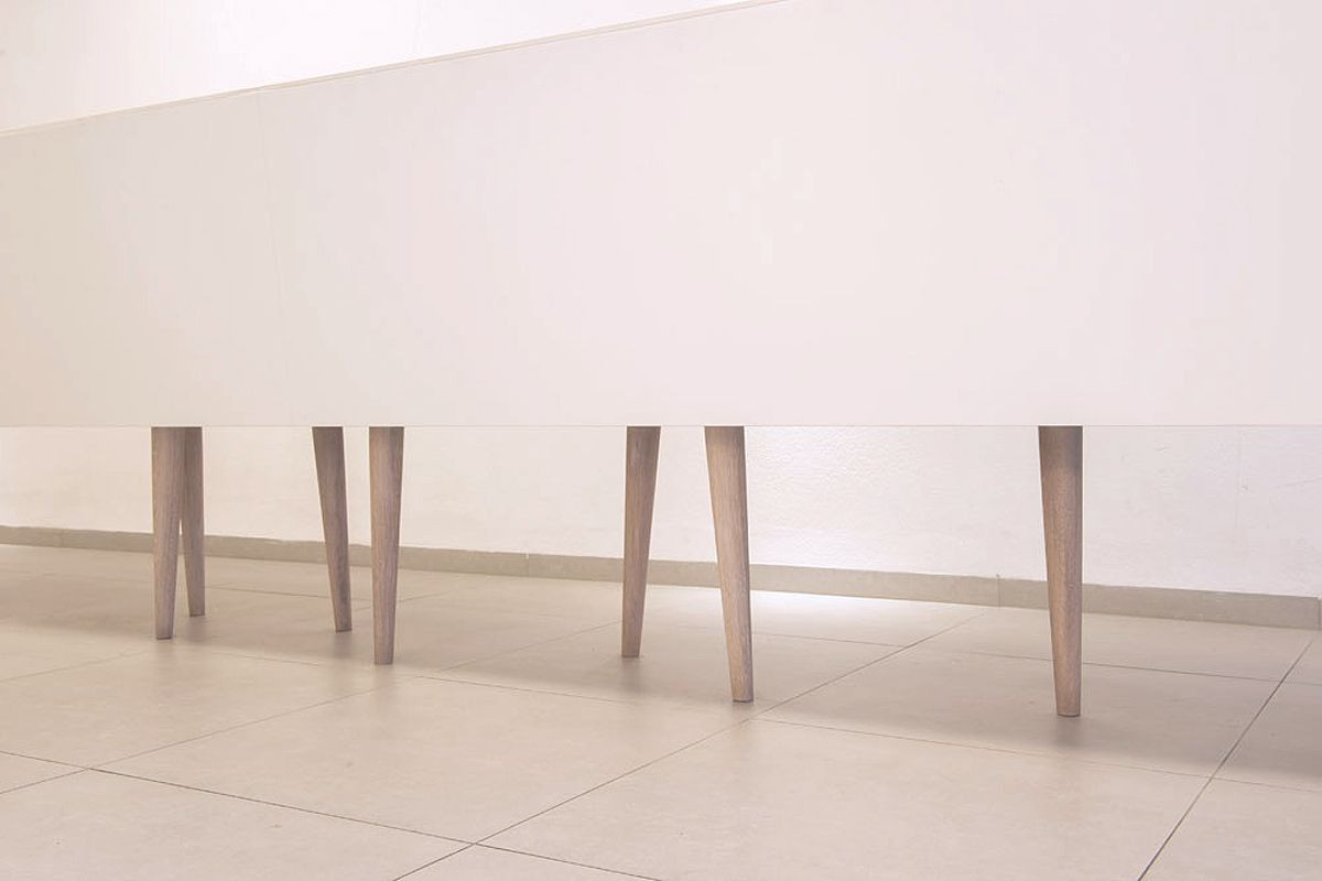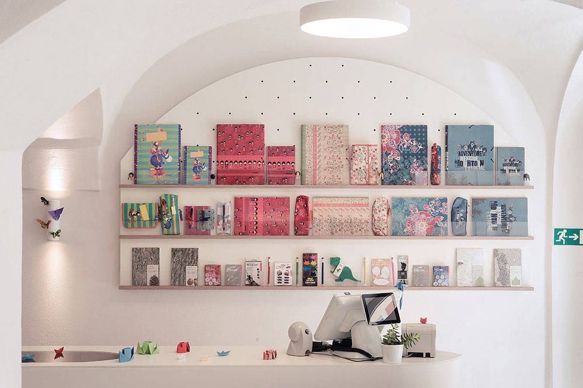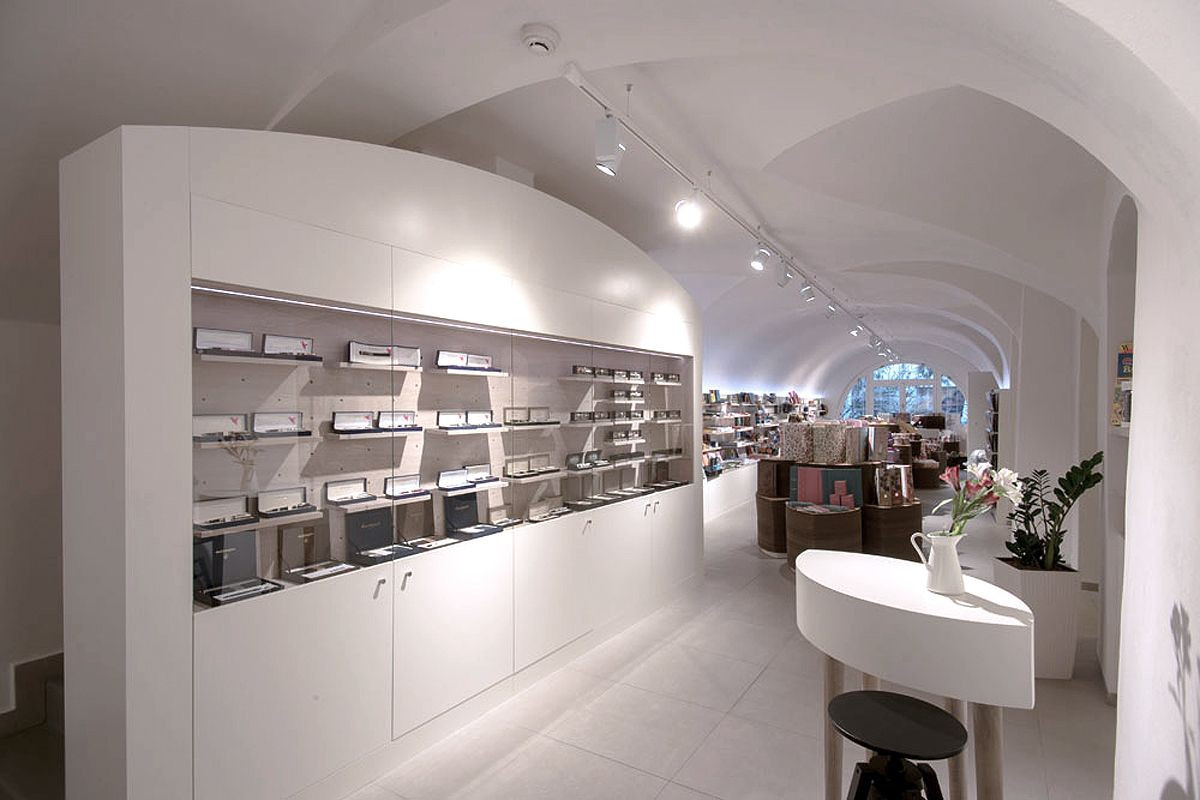 Nový obchod se skládá ze čtyř částí s různým charakterem i sortimentem zboží a tím i vybavením, které mělo obecně umožnit maximální variabilitu. Převládající bílá barva sjednocuje různé materiály, nechává vyznít samotné zboží a matným povrchem evokuje papír.