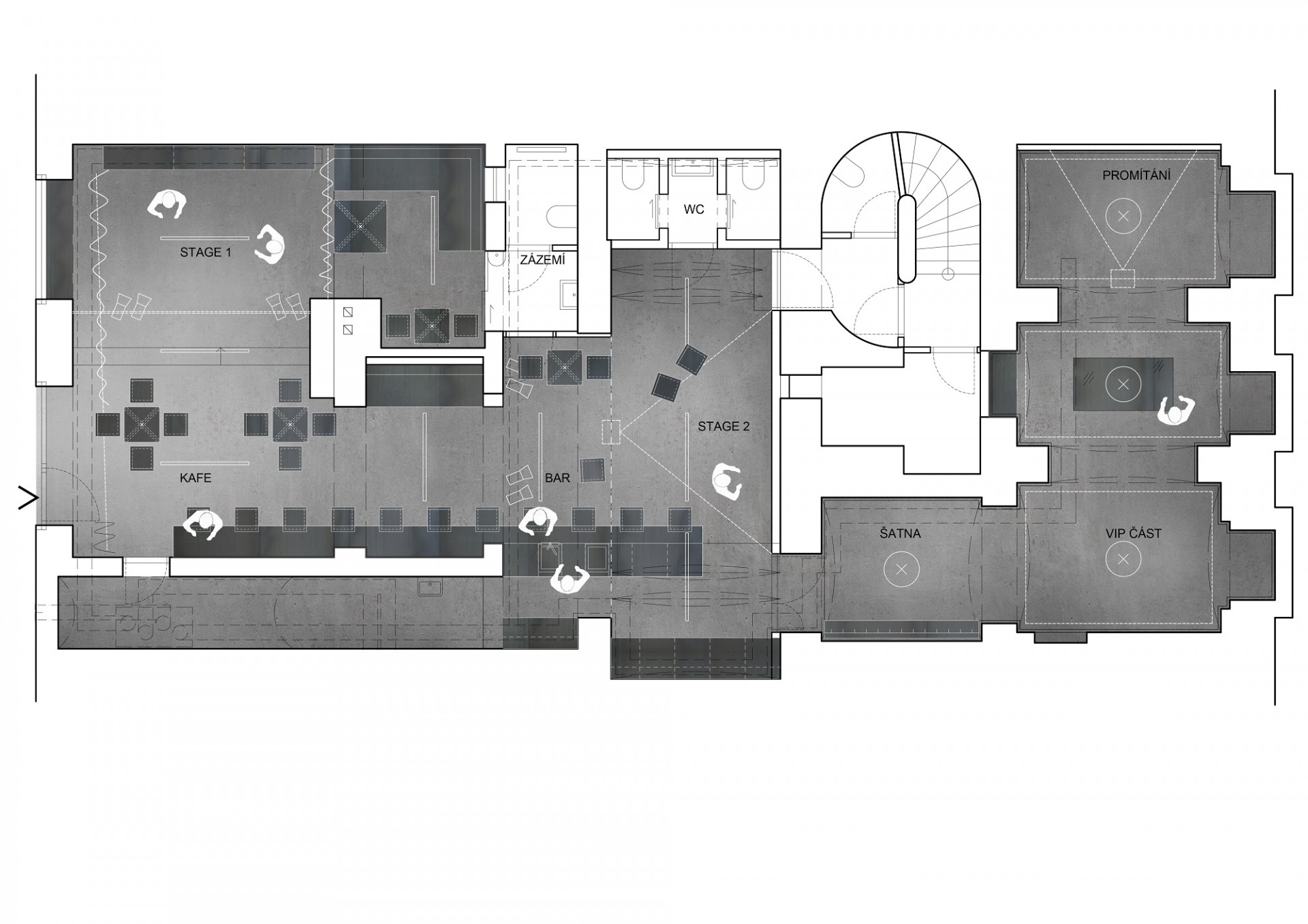 Tmavé stěrky na podlaze a stěnách, akustický podhled a černé závěsy jsou dále doplněny o autorský nábytek ze surové oceli. Použité materiály a povrchy vytvářejí specifickou scénickou atmosféru, která odpovídá kulturnímu zaměření nově vznikajícího podniku.