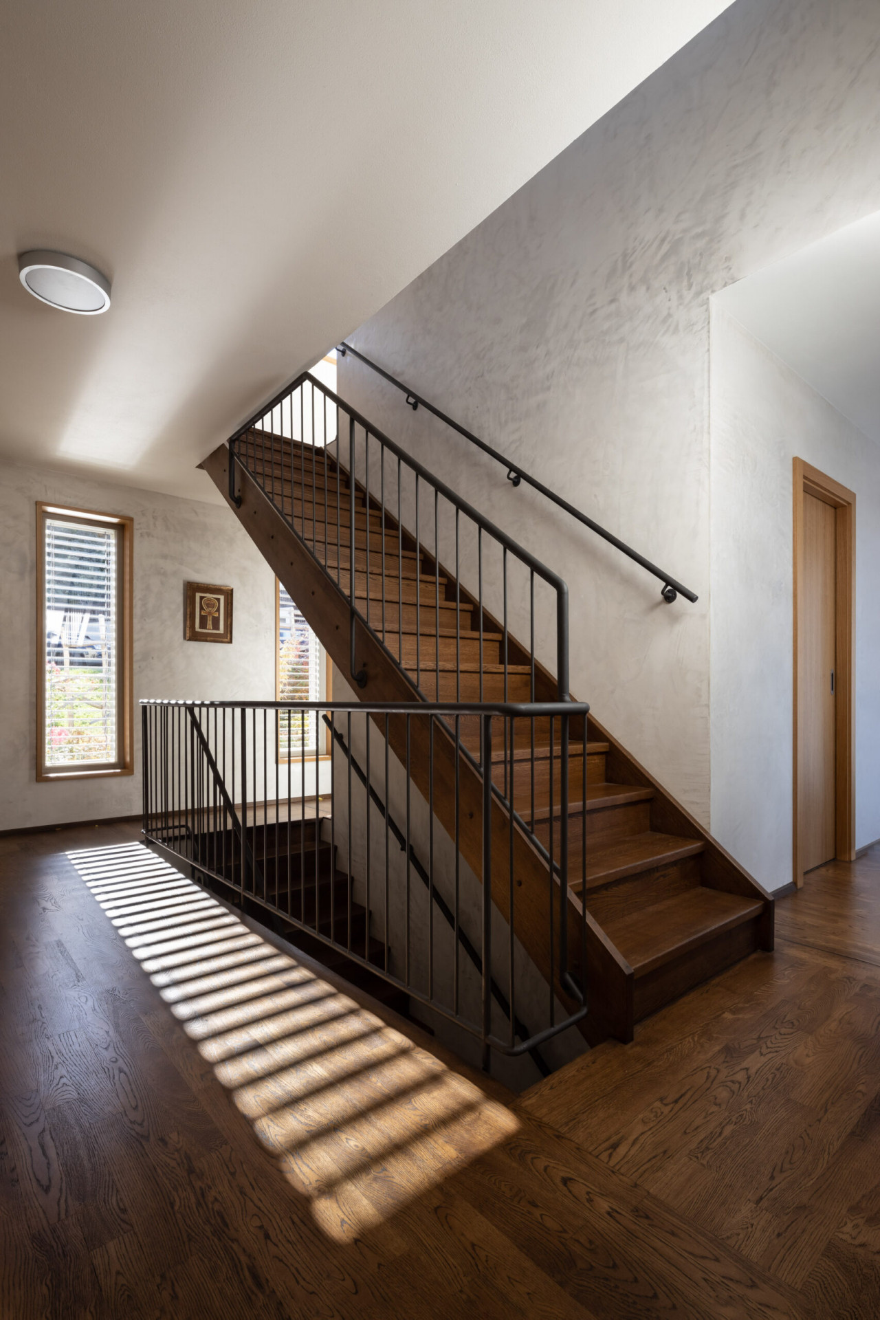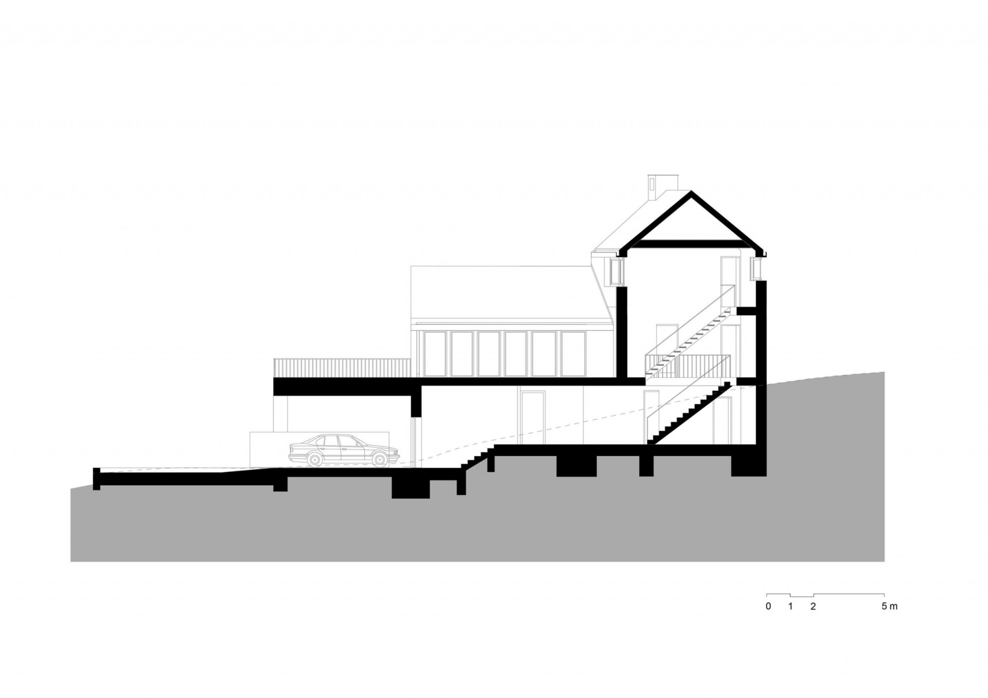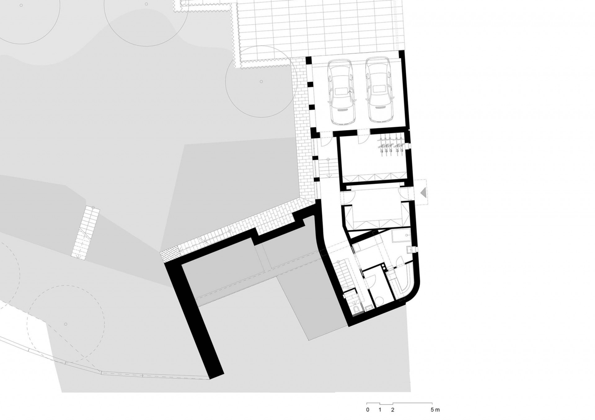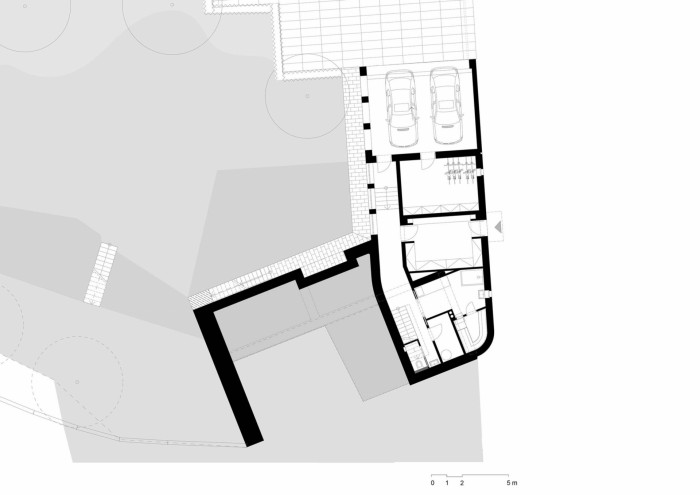 Po schodišti nahoru jsou přístupné ložnice dětí. Směrem dolů se pak nachází částečně podsklepená vstupní část domu se šatnou, technickým zázemím a krytým garážovým stáním.