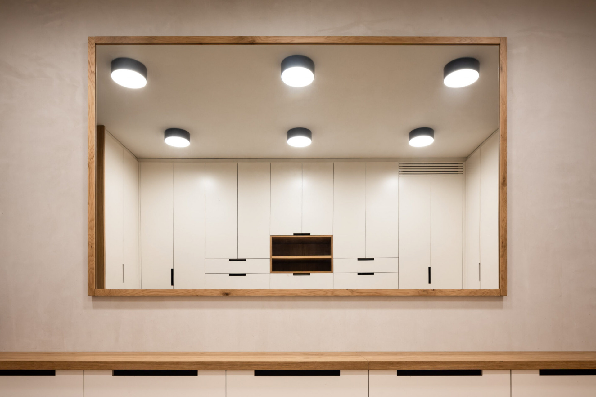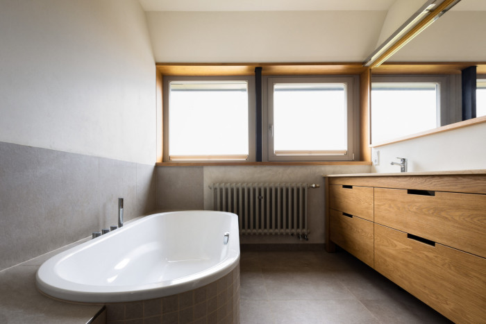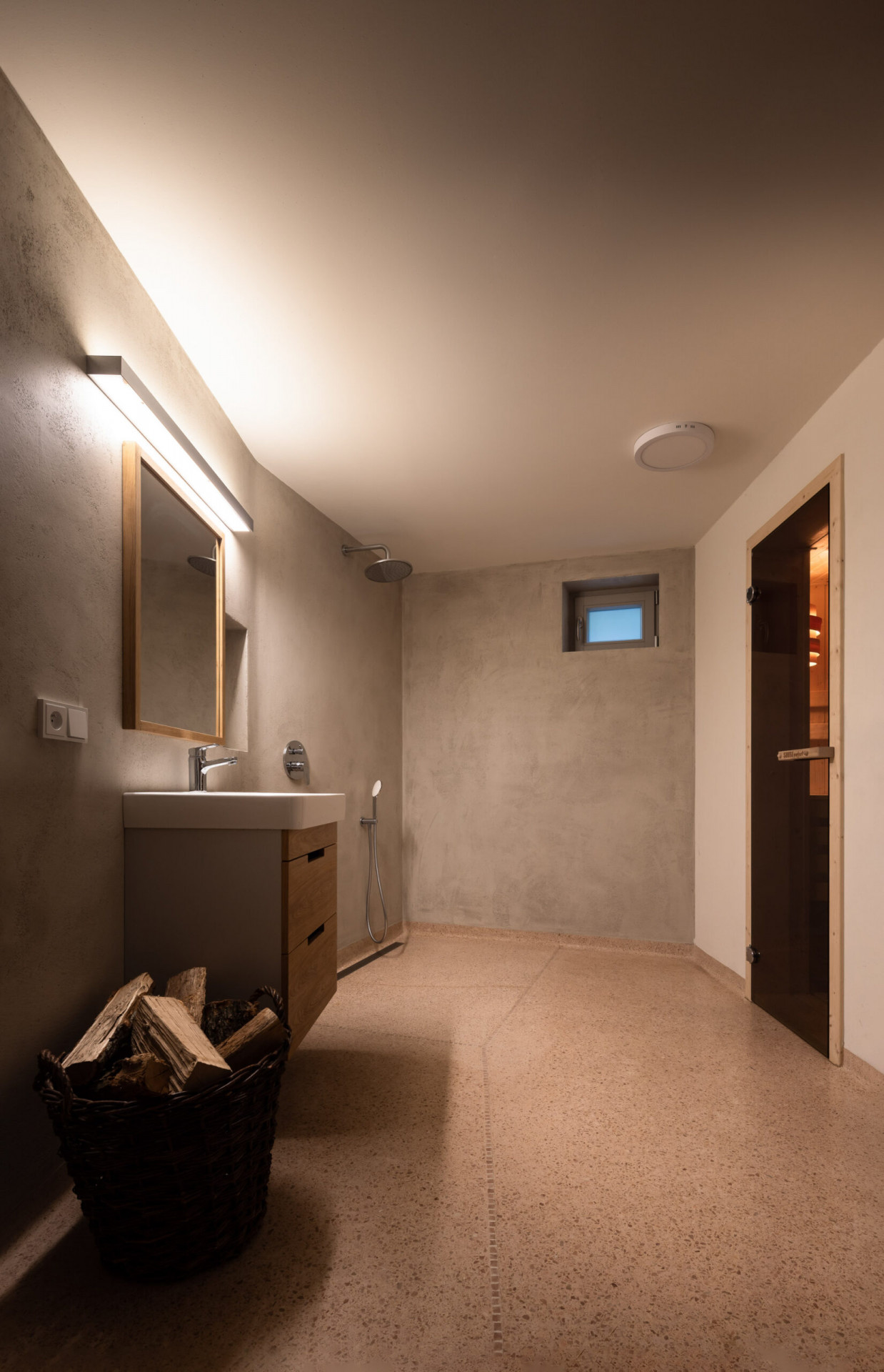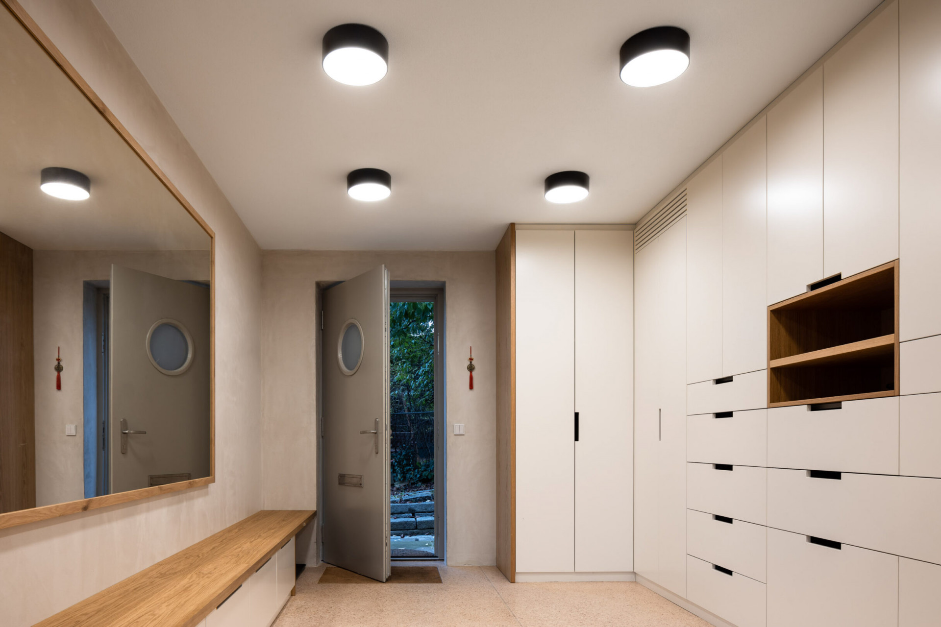 Po schodišti nahoru jsou přístupné ložnice dětí. Směrem dolů se pak nachází částečně podsklepená vstupní část domu se šatnou, technickým zázemím a krytým garážovým stáním.