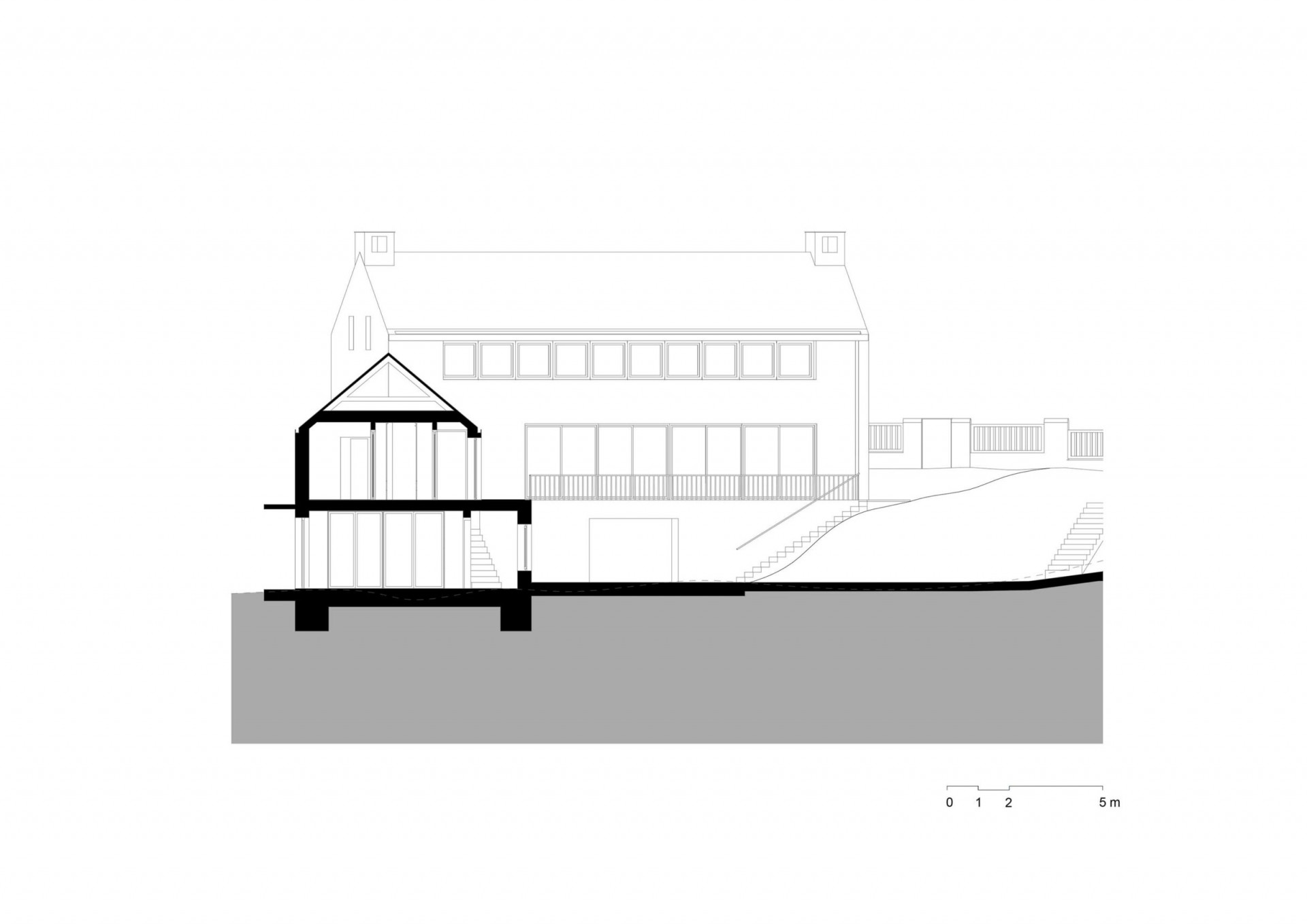 Kratší průčelí je tvořeno podlažím vystupujícím ze svažitého terénu s jednopodlažní nástavbou. Umístění vjezdu na pozemek při severní straně je zachováno ve stávající poloze, ve středu tohoto průčelí se nachází i hlavní vstup do domu. V místě původního vstupu na pozemek z ulice V domcích je navržena zahradní branka.