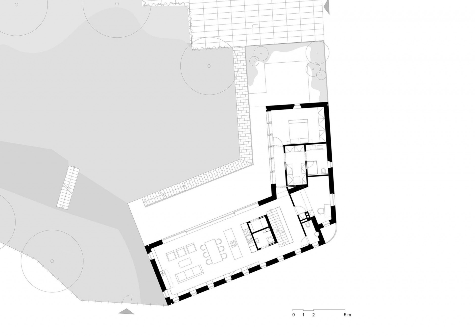 Dispoziční řešení domu: v prvním nadzemním podlaží, v úrovni horní zahrady, přecházející v terasu se nachází pobytová část domu s kuchyní a obývacím prostorem, ložnicí rodičů a hostinským pokojem.