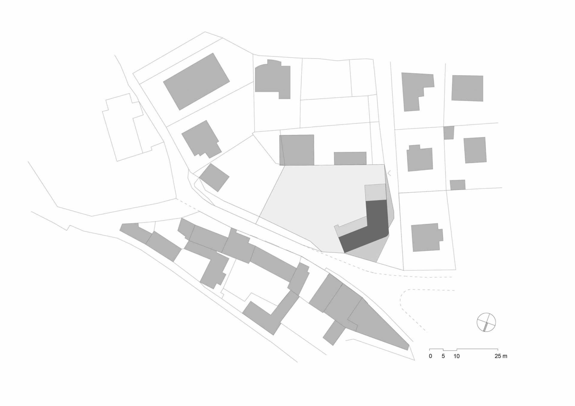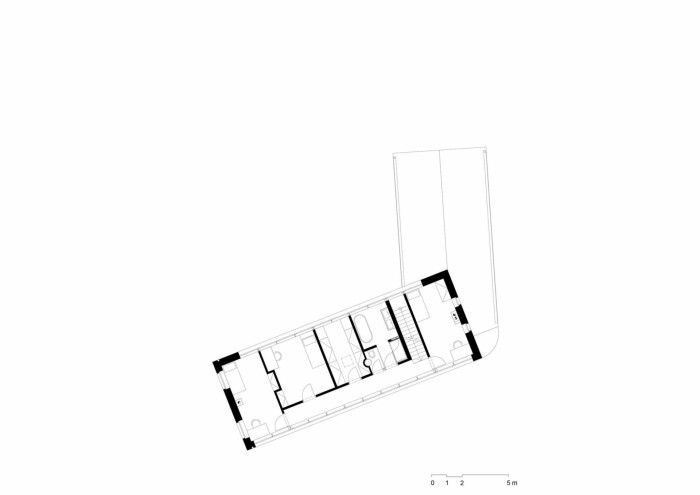 Průčelí hlavní hmoty domu zůstává na původním místě a jasně vymezuje charakteristický prostor piazzetty na křižovatce ulic V domcích, Pod Hvězdou a Sbíhavá. Kratší průčelí domu podél ulice Pod Hvězdou je oproti původnímu stavu posunuto dovnitř pozemku a rozšiřuje ulici Pod Hvězdou.