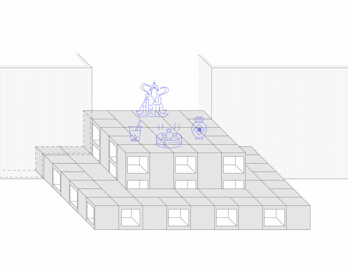V západní části byla z betonových tvárnic zkomponována vyvýšená konstrukce připomínající domovní svatyni - tradiční prvek v taiwanských restauracích a domovech, na které se vzdáva úcta předkům a ochranným bohům - zde plní funkce odpočinkového sezení po jídle a jako výstavní prostor.