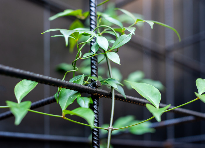 Pro oddělení zahrady od prostoru popelnic (bytového domu) byla v této části plotu navržena a svařena ocelová mřížová konstrukce z betonářské výztuže o průměru 8 mm. Uspořádaná je do 30 cm ocelových kostek, které přesahují dřevěný plot a jsou podepřené květinovým záhonem z betonových tvárnic. Konstrukce opět poskytuje oporu popínavým rostlinám, které postupně prorůstají mřížovinou a tvoří tak pohledovou i čichovou bariéru oddělující popelnice a zároveň obklopují hosty zelení.