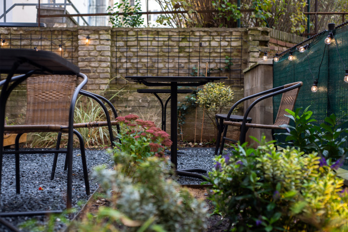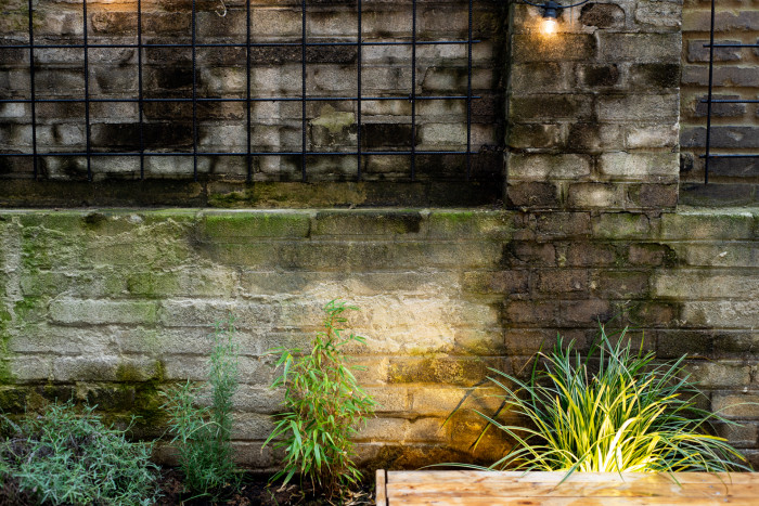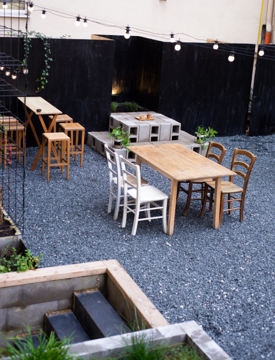 V návaznosti na tento koncept a z důvodu nízkého budgetu se návrh snaží využít co nejvíce stávajících prvků, jako jsou opěrná zeď, variace zahradního nábytku, odhalení a nastavení schodiště z betonových tvárnic či využití plechu ze starých stolů pro oddělení záhonů a pochozí plochy. Stará dřevěná podlaha musela být z důvodu havarijního stavu odstraněna. Pro novou pochozí plochu byl zvolen tmavý stavební štěrk. Stávající opěrná zeď byla zbavena staré omítky, aby tak odhalila svou původní krásu připomínající zarostlé venkovské ruiny. Ocelové kari sítě, které se obvykle používají jako výztuž do betonových desek, byly natřeny na černo a připevněny do opěrky, aby po nich mohly šplhat rostliny z nově zřízeného podélného záhonu při patce opěrné zdi.
