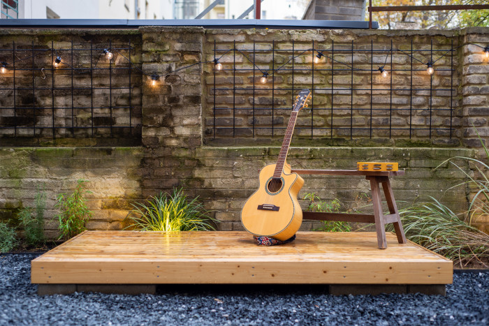 Naproti vstupu na zahradu bylo navrženo pódium sloužící pro čajové ceremoniály, hudební performance, představování jídel či jako hrací koutek. Pod pódiem se skrývají zdroje světla, které vrhají stíny rostlin na opěrnou zeď za nimi.