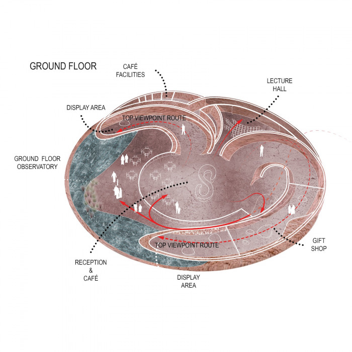 Z parkoviště vede přístup do budovy skrze střechu, na které je umístěno jezírko (pink lake) prosvětlující průhledným dnem prostor hlavní haly budovy pod sebou. Pozvolnou rampou sestoupí návštěvníci záhybem mezi rotujícími tubusy trupu budovy na vyhlídkovou terasu stíněnou proti slunci levitujícím převisem budovy – tubusem obsahujícím expoziční část a hlavní vyhlídku na rezervaci. Terasa je od prostoru rezervace oddělena zálivem tvořeným vodním prvkem se slanovodním biotopem obsahujícím mikroorganismy specifické pro rezervaci. V naší vizi pracujeme s obsahem expozice jako s komplexnějším útvarem, který využívá téma specifického prostředí rezervace k obecnějšímu nastínění metodiky, jak fungují principy založené na přebarvování (plameňáci voda, korýši rostliny, řasy) pomocí obsahu karotenoidů a dalšími možnými přesahy. Expozice je koncipována jako částečně živá s použitím rostlin a akvárií udržujících v prostoru příjemné klima s odlišnou vlhkostí. Postupem expozicí se návštěvníci dostávají do kulminačního výškového bodu tubusu, kterým je širokým panoramatickým oknem umožněn maximální výhled do rezervace. Dalším dramaturgickým principem dělení pohybu návštěvníků tak je dělení na pohyb v chráněném prostředí návštěvnického centra (interiér a stíněné terasy) a na pohyb po samotné rezervaci a partii parkoviště vystavené otevřenému působení povětrnosti.