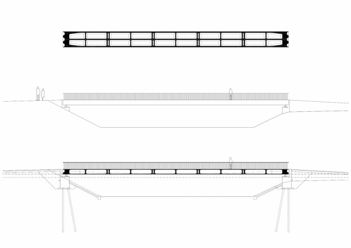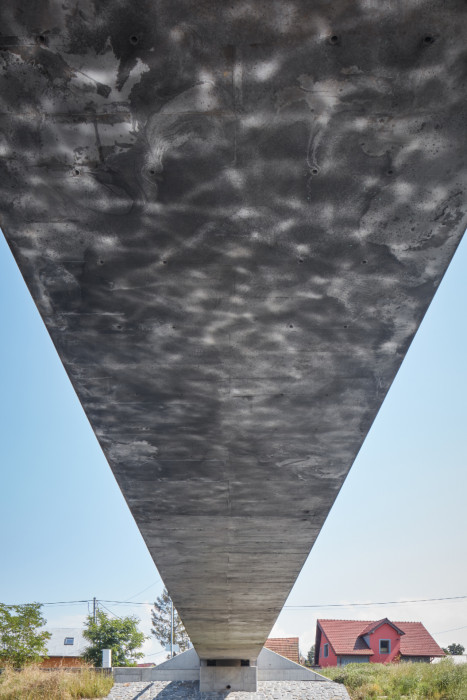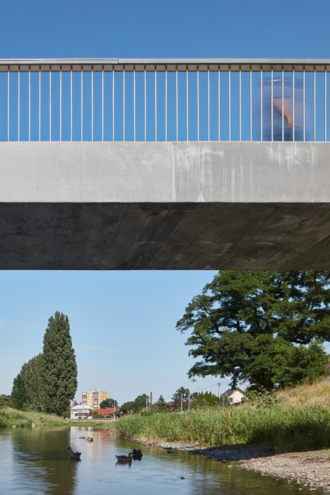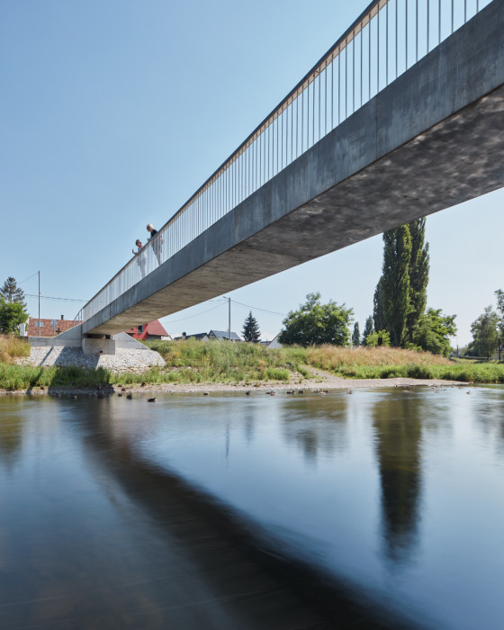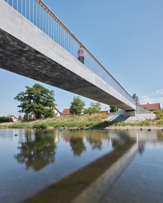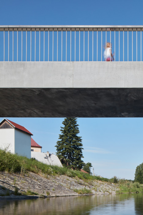Most je navržen jako minimalistický objekt z dokonalého materiálu. Nejpodstatnější je sochařská kvalita mostu. Jednoduchá geometrická forma a odstranění všeho nepodstatného umožňuje návštěvníkovi intenzivně vnímat základní obsah tohoto archetypu. Forma mostu je lapidární, most jako kámen položený přes vodu je nejstarší formou mostů. Povrch mostu je ušlechtilý, konstrukce je navržena z lesklého hladkého betonu. Zábradlí je z kruhových nerezových tyčí, madlo je dřevěné, masivní, široké, lakované lodním lakem. Osvětlení mostu pomocí světel v madle zábradlí.