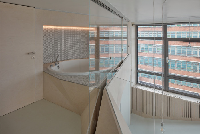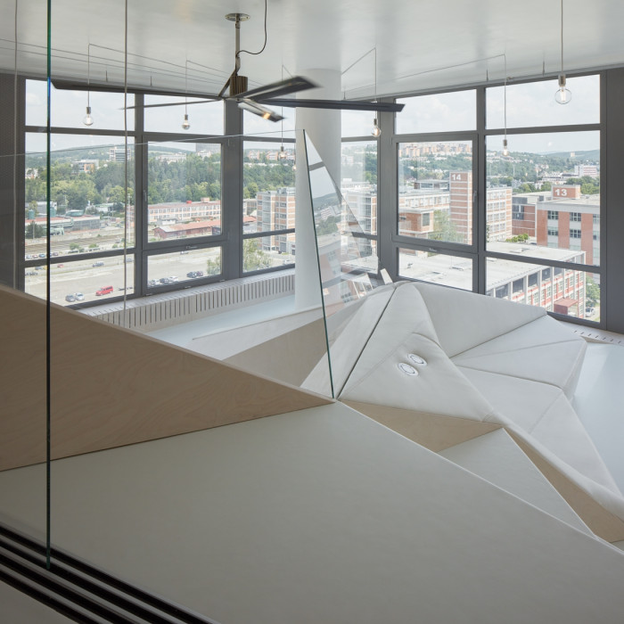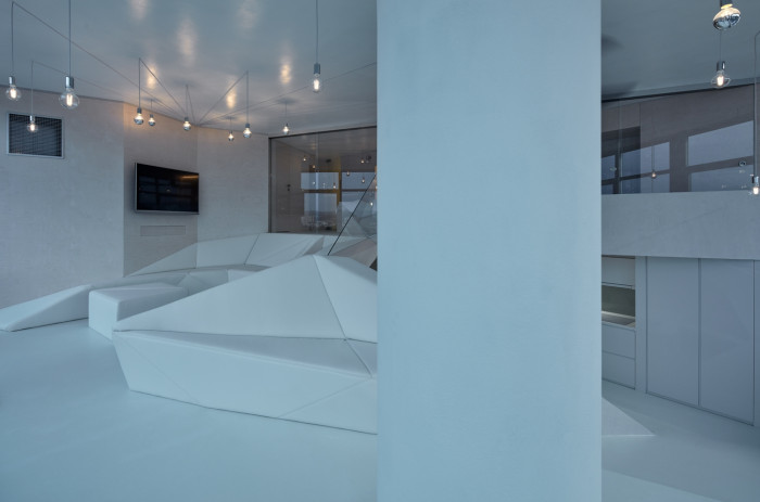 Interiér je definován jako kompozice hlavního volně tvarovaného společenského prostoru opřeného do zalomené nábytkové příčky a vestavěné kuchyně ukrývající za sebou dva pokoje, koupelnu, vstupní zádveří a „tajné“ schodiště. Skrze tuto příčku vstupujeme do hlavního převýšeného prostoru definovaného vloženou rampou nastoupávající z obytné kuchyně s jídelním zálivem přes dětský kout zakousnutý do parapetu okna a záliv vymezený dvěma atypickými pohovkami až do ložnice s vestavěnou kruhovou vanou. Tvar vrostlý do podlahy a stěn interiéru je tvořen strukturou sestavenou z trojúhelníků, která se spirálovitě obtáčí kolem středu dispozice a vytváří pódium, jež je zároveň hledištěm přivráceným k výhledu na město. Rotující struktura do sebe integruje atypické pohovkové prvky a plynule navazuje na obložení svislých stěn oddělujících soukromé části interiéru.
