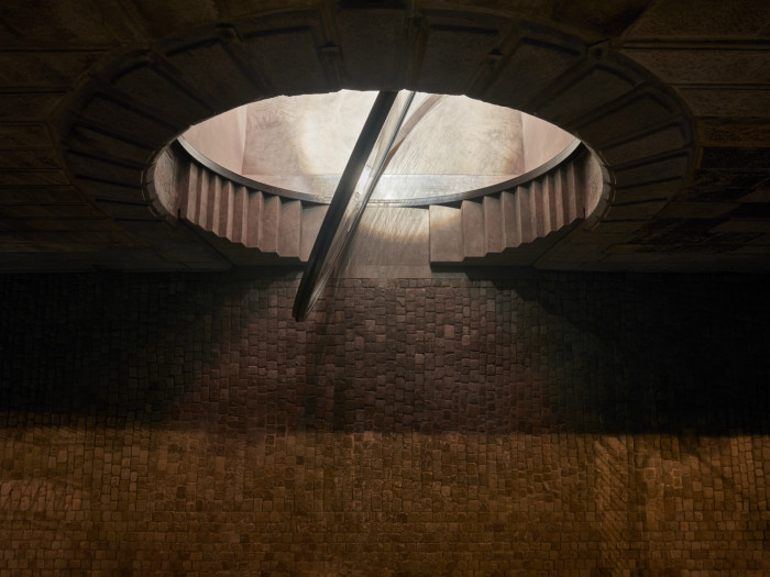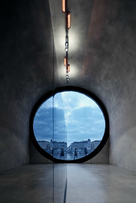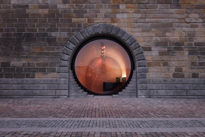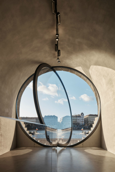 Součástí kompozice je doplnění ostění stávajících otvorů stupňovitou formou rozvíjející motiv dříve vloženého schodiště, v jehož tělese jsou skrytě integrovány přístupy do instalační šachty pod portálem, výdechy vzduchotechniky a montážní prvky protipovodňového opatření. Eliptická pivotová okna mají průměr 5,5 m, tloušťku organického skla 7 cm a hmotnost přibližně 2,5 t. Každé má unikátní tvar a vzhledem ke své velikosti přesahující možnosti standardního zasklení, jde pravděpodobně o největší pivotová okna na světě. Pohyb je řešen motoricky, v provozní pozici jsou okna zafixována v poloze 60° pootevření, dalšími možnostmi je automatické senzorické otvírání ovládané pohybovými čidly nebo otvírání obsluhou baru.