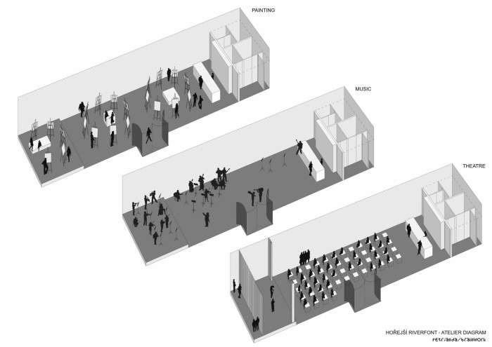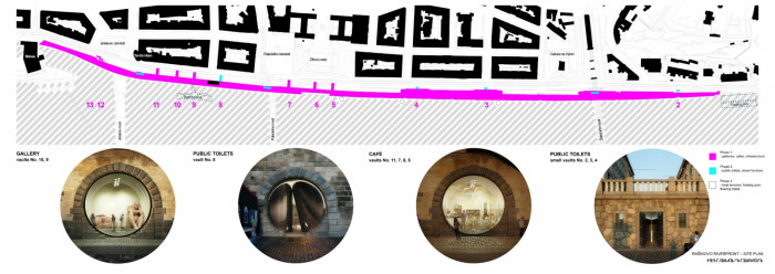 Náplavky jsou veřejným prostorem celoměstského významu, jsou pražským pobřežím umožňujícím jedinečnou symbiózu veřejného prostoru s míchou města – řekou Vltavou. V regulované části břehů se z nábřežní architektury stává pro míchu řeky páteř, která skrze jednotlivé „obratle“ náplavek drží skeletální systém města, na nějž je navěšena celá urbanistická struktura tvořící jeho tělo. Tento skelet nesmí být zatvrdlý, vypreparovaný a zaživa petrifikovaný jako památkový relikt a musí umožnovat proudění a kulturní život celopražského významu postavený na autenticitě architektonické a obsahové. V naší revitalizaci tuto rovinu iniciujeme a vytváříme funkční napětí mezi otevřením prostor kobek a jejich obsahovým využitím vycházejícím z jedinečného kontaktu s exteriérem, napětí mezi náplavkovým „splendid isolation“ bezprostředního vztahu s řekou a sekundární vazbou k městu z horní úrovně nábřeží. Pracujeme s charakteristickým přístupem k prostorovému detailu, naše zásahy jsou zároveň kontrastní a zároveň doplňují celek smysluplnými (smyslovými) fragmenty principem jako doplňuje oko tvář a je jeho čidlem stejně jako nedílnou součástí.